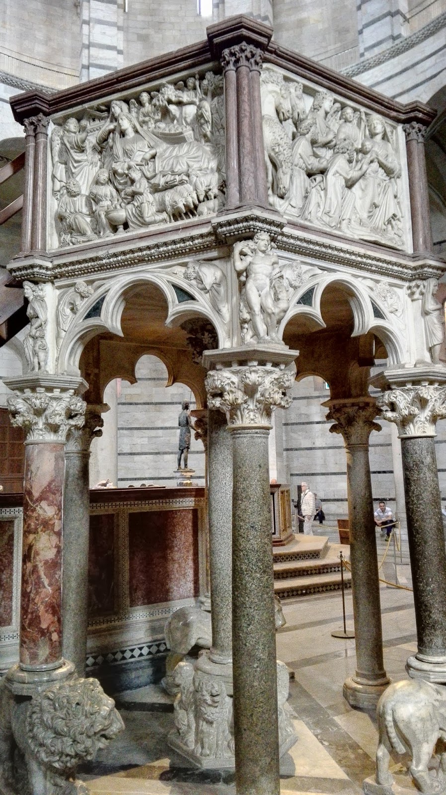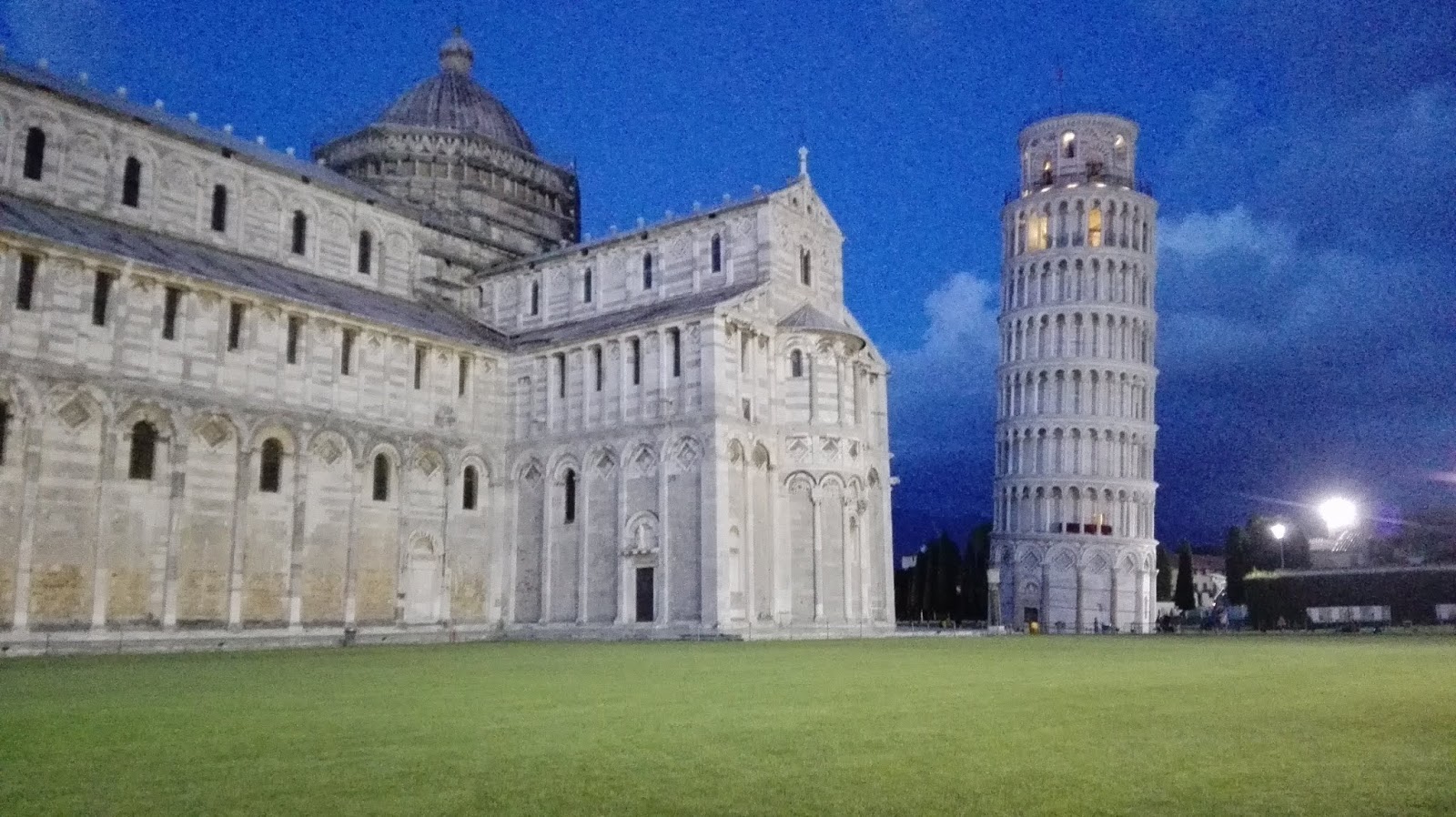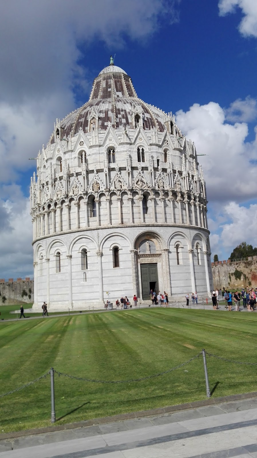Bardzo lubiłam wracać na Piazza dei Miracoli, bo prezentuje się on pięknie o każdej porze dnia, nocy też. Czasem przysiadywałam na trawie, żeby podziwiać ten niezwykły widok, ale nie wytrzymałam długo, przez silny, przeszywający wiatr. W zależności od tego, z której strony wchodziłam na plac, witał mnie inny widok, a ja zawsze stałam dłuższą chwilę jak urzeczona. Wchodząc pierwszy raz, pierwszą rzeczą, jaką ujrzałam była właśnie Krzywa Wieża, dopiero idąc dalej, odkrywałam pozostałe skarby dumnie stojące na placu. Z kolei wchodząc przez Porta Santa Maria, pierwszym co widzimy, jest Baptysterium św. Jana Chrzciciela. Dzwonnica zdaje się wtedy „wyglądać” zza katedry, jakby chciała zobaczyć, co to za nowi goście wchodzą podziwiać te wszystkie cuda. I właśnie każdej z tych perełek chciałabym poświęcić kilka słów.
