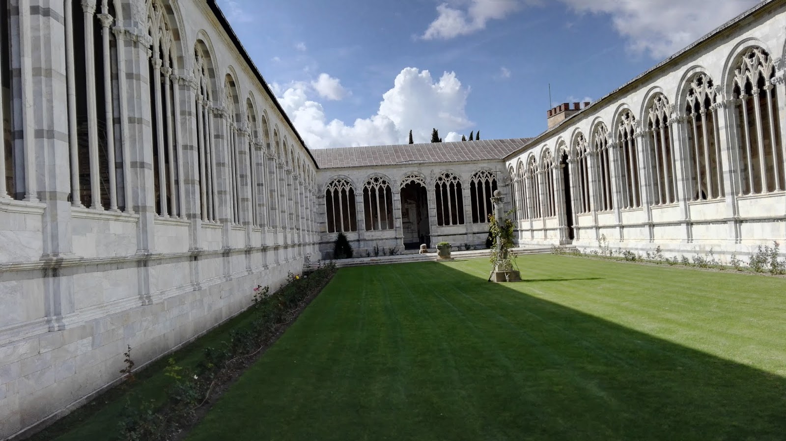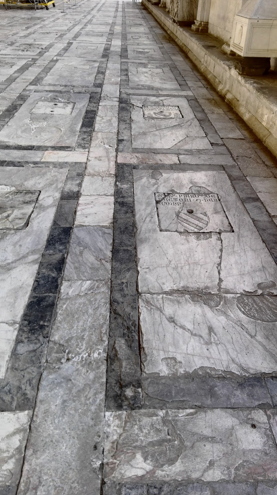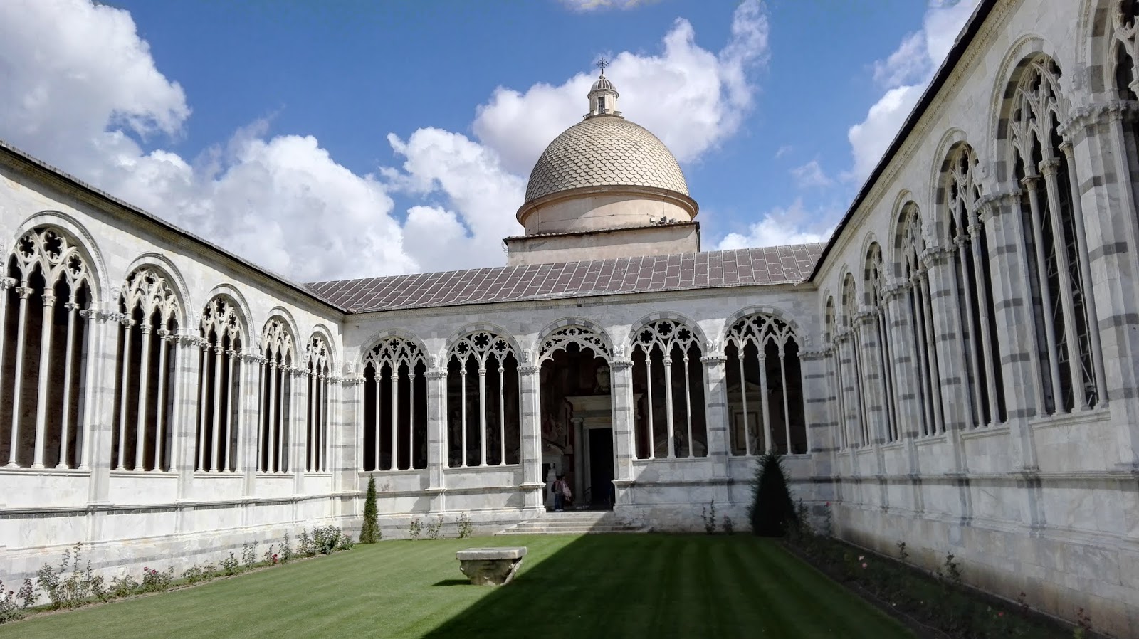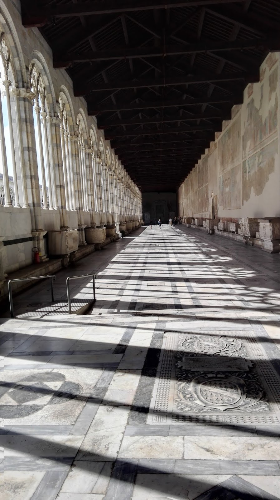 Camposanto to nic innego jak cmentarz. Jednak nie jest to taki zwyczajny cmentarz, jakie znamy tutaj w Polsce, o jego wyjątkowości świadczy też relikwia, która jest tu przechowywana – ziemia przywiezioną z Golgoty, po jednej z wypraw krzyżowych. Nekropolia ma kształt czworoboku, otoczonego otwartymi od wewnątrz krużgankami. Wewnątrz można znaleźć wiele malowideł, fresków oraz oryginalne sarkofagi. Warto też spojrzeć pod nogi. Dość długo spacerowałam wewnątrz tych krużganków, cały czas mając świadomość, gdzie jestem i po czym stąpam. Może wyda Wam się to dziwne, bo jak długo można chodzić po cmentarzu, ale uwierzcie mi, że jest to miejsce wyjątkowe, a wykonanie i niezwykłe formy niektórych płyt nagrobnych wręcz zmuszają do poświęcenia im większej uwagi.