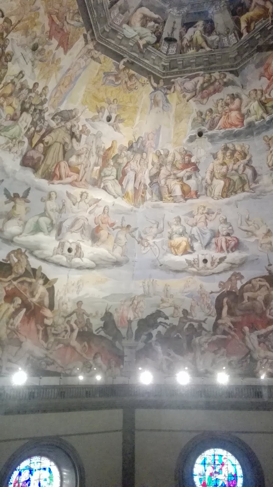 Po południu czekały na mnie kolejne 463 schodki prowadzące na katedralną kopułę – wyjątkowej urody dzieło Filippo Brunelleschiego, widoczne z każdego miejsca w mieście, jego znak rozpoznawczy. Byłam bardzo ciekawa, jak wygląda panorama Florencji bez widocznej kopuły. Podobnie jak przy wchodzeniu na dzwonnicę, tutaj też nie trzeba pokonywać całej „trasy” na raz, ale można złapać oddech, kiedy poczujemy się zmęczeni. Żałuję tylko, że nie mogłam wystarczająco czasu spędzić wewnątrz kopuły, żeby podziwiać niezwykłe freski. W biegu też nie da się uwiecznić tego wszystkiego na zdjęciu, tak jak należy 😉. Jeśli mogę coś doradzić, to proponuję ubrać się wygodnie i mieć dwie wolne ręce, zwłaszcza na ostatnim etapie wspinaczki, kiedy trzeba pokonać dość wysokie stopnie i niemal wciągnąć się po poręczy. Mnie długa sukienka, kurtka trzymana w dłoni i torba przewieszona przez ramię nie ułatwiły tego zadania 😉. Przyznam, że oglądanie panoramy z tego miejsca, mimo pięknego widoku, nie jest przyjemnością dla kogoś, kto cierpi na lęk wysokości. I chociaż rozpościeraała się przede mną Florencja, skąpana w świetle zachodzącego powoli słońca, byłam w stanie zrobić tylko kilka zdjęć i szybko zeszłam na dół. Pewnie zdziwicie się, czemu nie uciekłam tak szybko z wieży, ale stałam tam jak urzeczona i niechętnie wracałam. Otóż stojąc na górze kopuły, stałam na marmurowym podłożu, z dość niską barierką. Bujna wyobraźnia podpowiadała mi obrazy, w których ślizgam się i wypadam na zewnątrz. Dodajcie do tego wiatr. Zabezpieczenia na dzwonnicy wzbudzały we mnie większe poczucie bezpieczeństwa.