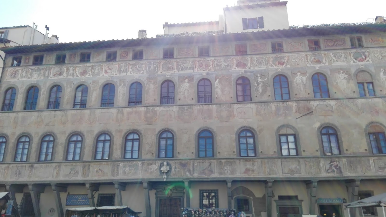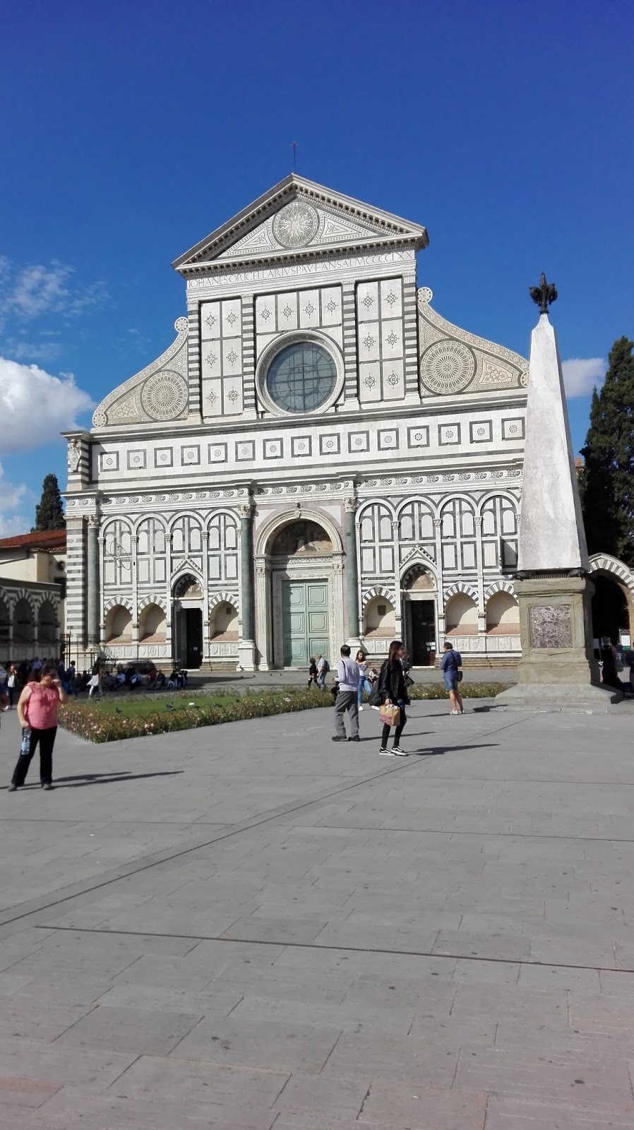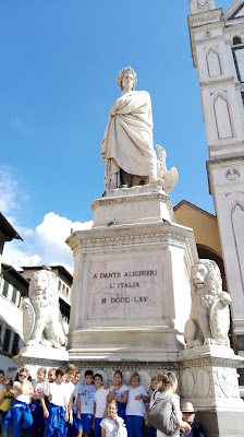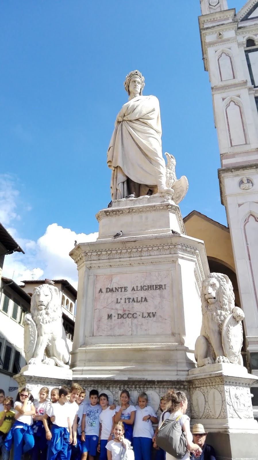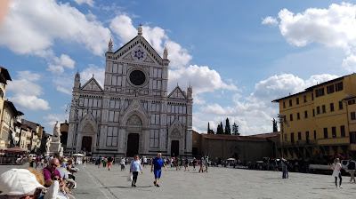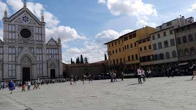 Po wyjściu z Galerii, po trzech godzinach uderzeniowej dawki sztuki, uświadomiłam sobie, że ciągle jeszcze nie zjadłam śniadania. Znalezienie jakiegoś dobrego cornetto po godzinie dwunastej stanowiło nie lada wyzwanie. W końcu udało mi się trafić na niewielką kawiarnię i zakupić ostatnie świeże rogaliki. Po posiłku spacerem wyruszyłam na dalsze podbijanie Florencji. Pierwszym miejscem, do którego się udałam, był Piazza Santa Croce ze stojącą tam Bazyliką Santa Croce oraz pomnikiem Dantego. To właśnie na tym placu rozgrywane są mecze calcio fiorentino – brutalne rozgrywki piłki florenckiej. W samej bazylice znajduje się wiele dzieł sztuki, freski autorstwa Giotta oraz pomniki nagrobne wielkich Włochów – m.in. Michała Anioła, Niccola Machiavellego, Galileusza. Wiem, że popełniłam ogromny błąd, ale nie zdecydowałam się na wejście do środka i zostawiłam tę przyjemność na kolejną wizytę we Florencji.