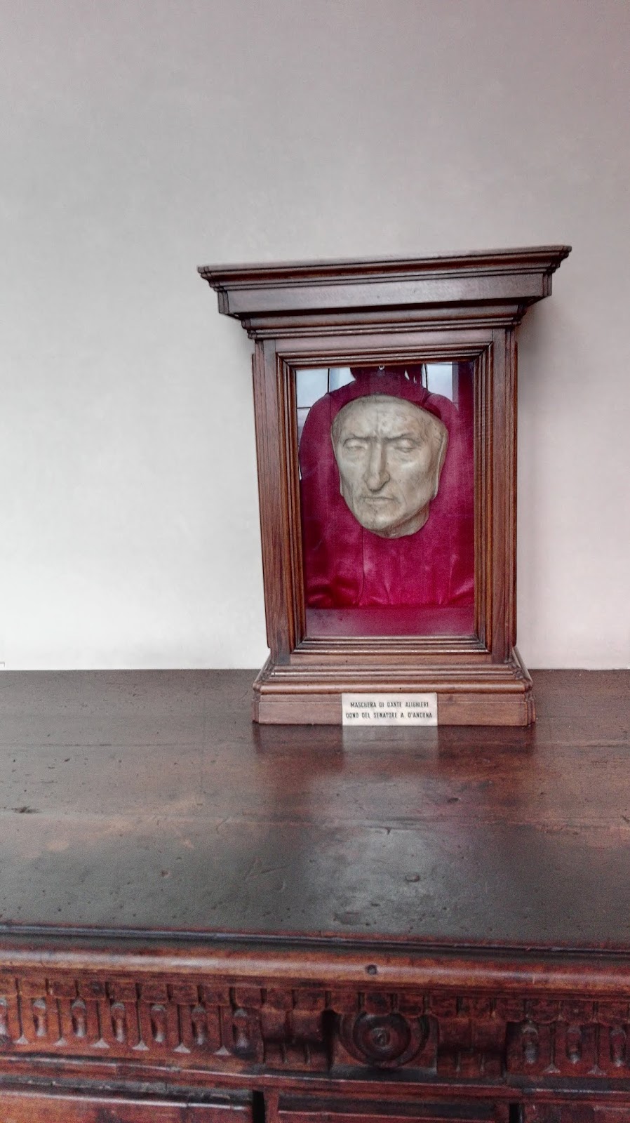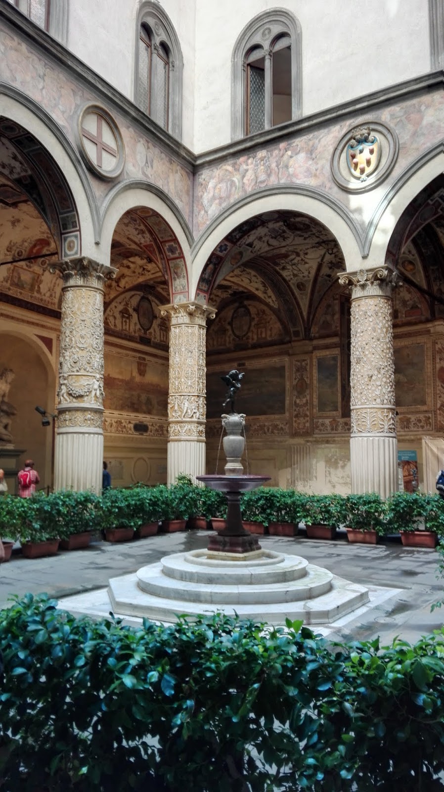 W Palazzo Vecchio swoją siedzibę mają lokalne władze, ale mieści się tu także muzeum sztuki. Przy wejściu do budynku można podziwiać rzeźby wielkich mistrzów, m.in. kopię „Dawida” dłuta Michała Anioła (oryginał można zobaczyć w Galleria dell’Accademia). Zdecydowałam się na zwiedzanie samego muzeum – wież i wspinaczek na jeden dzień już mi wystarczyło. Kupiłam bilet i wyruszyłam poznawać wnętrza pałacu. Tutaj też nie obyło się bez podążania śladami bohatera stworzonego przez Dana Browna – koniecznie musiałam zobaczyć słynną Salę Pięciuset, a w niej dzieło Vasariego ze słynnymi słowami: „Cerca, trova”. Kto czytał „Inferno”, wie doskonale o czym mówię, a kto jeszcze nie zdążył tego zrobić, polecam szybko nadrobić tę zaległość. Nie powiem, że bez trudu, ale w końcu znalazłam to, czego szukałam. Jeśli chodzi o samą salę, to gdy powiem, że robi ogromne wrażenie, równie dobrze mogę nic nie mówić. Nie umiem nawet znaleźć odpowiednich słów, a zdjęcia nie są w stanie oddać jej rozmiarów i wyjątkowości. To jedno z tych miejsc, które trzeba zobaczyć, żeby zrozumieć, co mam na myśli. Warta uwagi jest również sala map, w której nie było mi dane spędzić zbyt wiele czasu, bo tuż za mną weszła grupa hałaśliwych turystów, więc nie mogąc skupić się na mapach, jak najszybciej się stamtąd wymknęłam. W jednym z pomieszczeń znalazłam wspomnianą we wcześniejszym wpisie, pośmiertną maskę Dantego. Ciekawskim turystom udostępniono do zwiedzania najbardziej tajemnicze miejsca pałacu (percorsi segreti) – można odbyć prawdziwą podróż w czasie i poczuć się jak Medyceusze 😉.