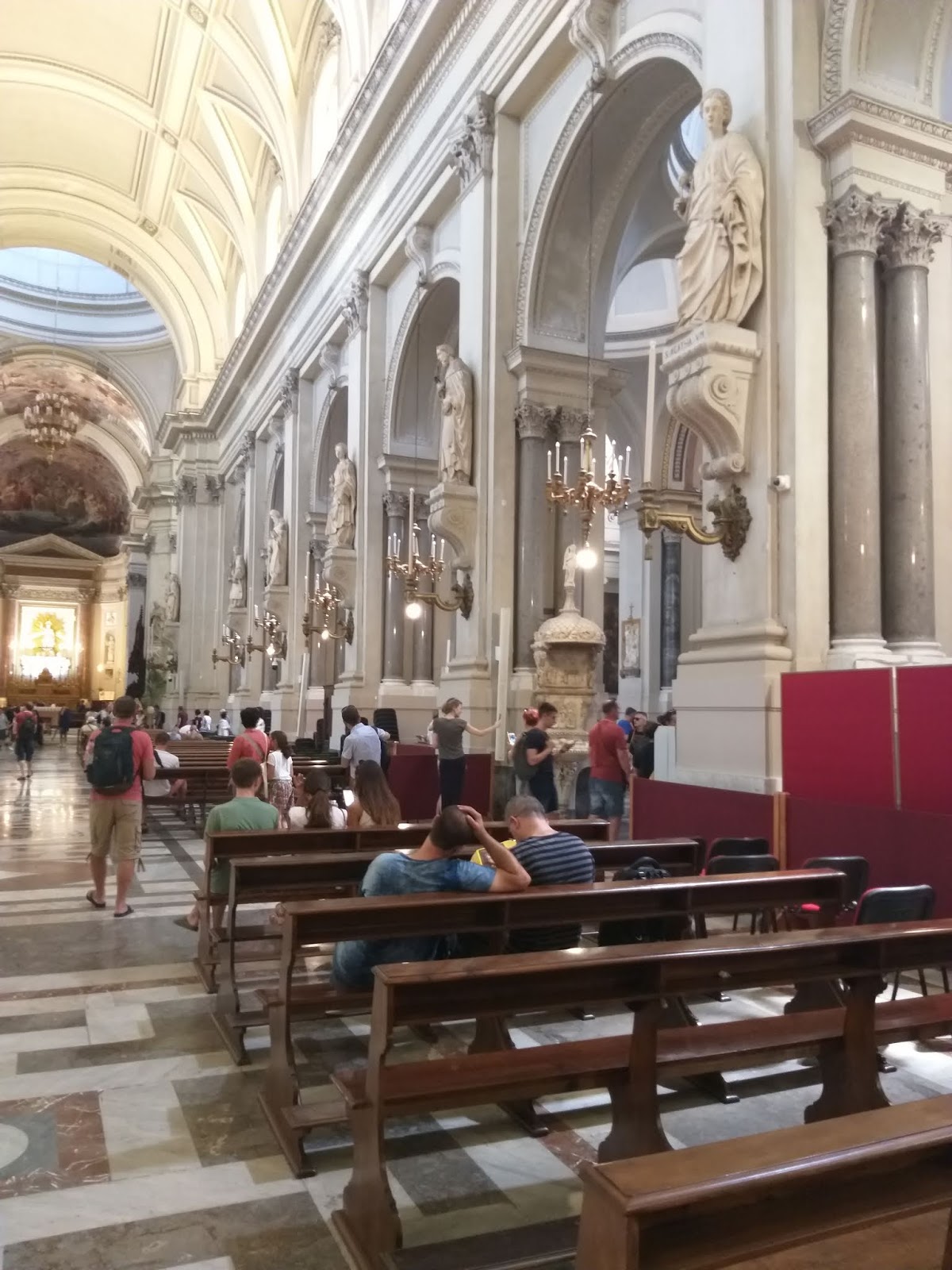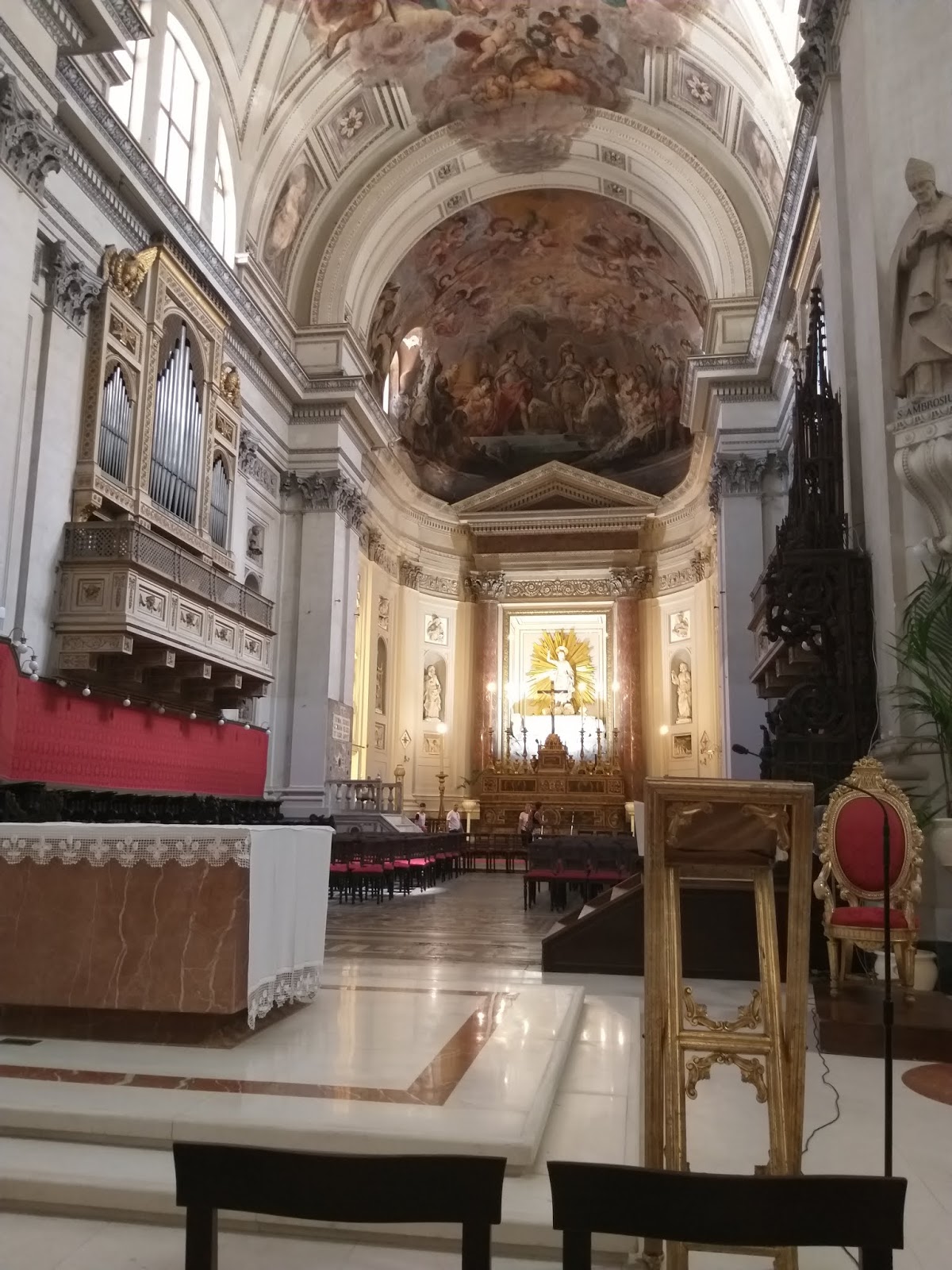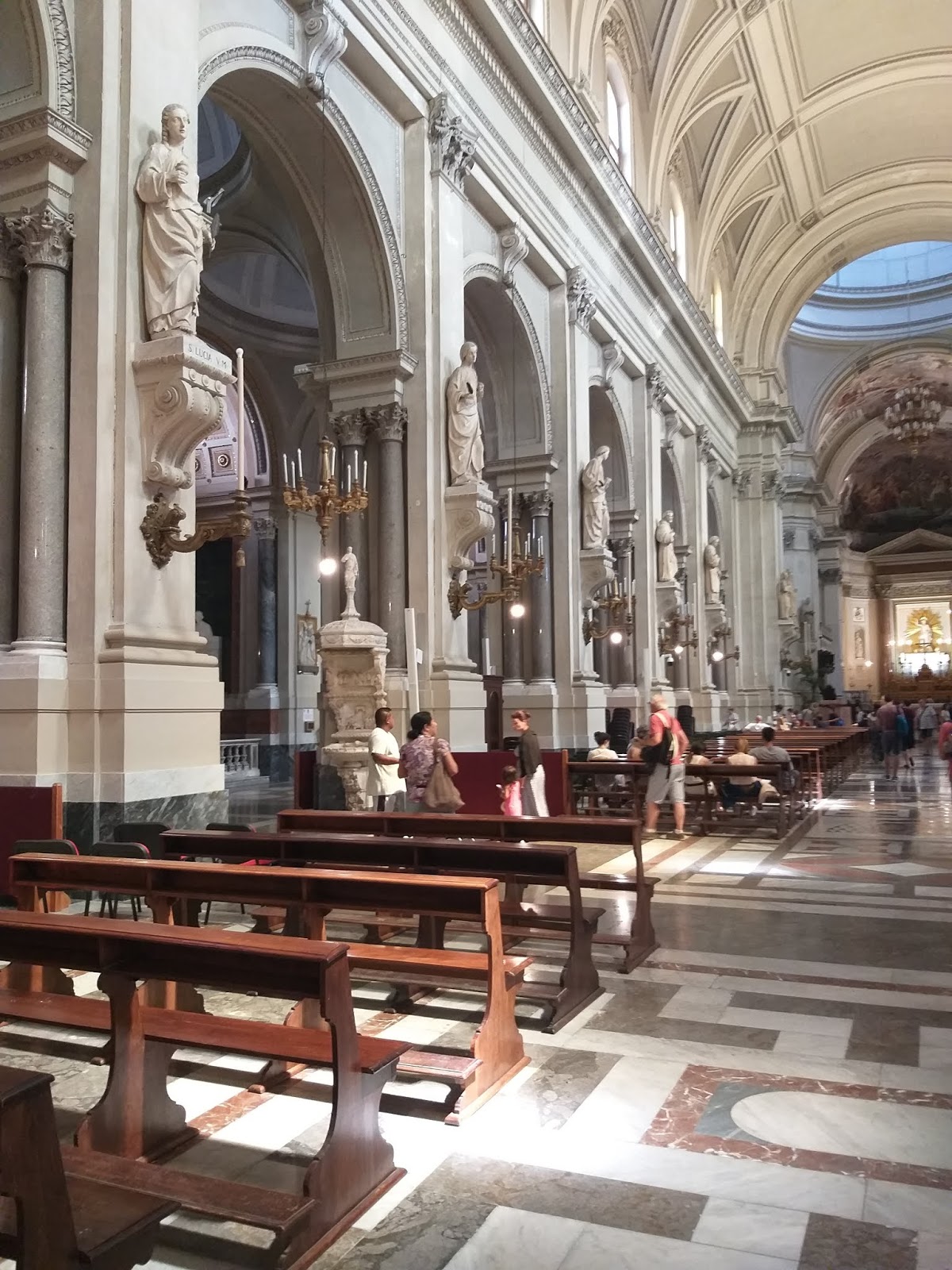 Jeśli pójdziecie wzdłuż Via Vittorio Emmanuele, w kierunku zachodnim, dojdziecie do katedry. To właśnie był kolejny z moich punktów, który postanowiłam obejrzeć nie tylko z zewnątrz, ale i od środka. Pierwotnie budynek wybudowany był w stylu gotyckim, dziś łączy w sobie różne style architektoniczne, bez trudu można rozpoznać w nim silne wpływy arabskie. Jeśli po dokładnym obejrzeniu budynku z zewnątrz, spodziewacie się takiego samego efektu w środku, przygotujcie się na spore zaskoczenie. Wnętrze katedry jest bardzo skromne, niemal pozbawione dekoracji i zupełnie nie przystaje do tego, co widzimy stojąc na placu przed kościołem. Przygotujcie się też, że każdy kto chce zwiedzić świątynię jest bardzo dokładnie sprawdzany pod kątem stroju – szorty, zbyt odsłonięte ramiona i dekolty niestety nie przejdą. Można też za 1 euro, zakupić specjalną pelerynę i okryć się nią przed wejściem. Sama ubrana byłam w długą letnią, niezbyt wydekoltowaną sukienkę, ale stojąca przy wejściu pani miała opory przed wpuszczeniem mnie do środka, przez zbyt mocno odsłonięte ramiona. Kiedy chciałam kupić pelerynę, ale miałam tylko banknot 50 euro, nagle moja sukienka okazała się w porządku i bez problemu mogłam wejść do kościoła 😉.