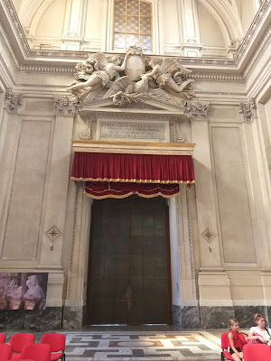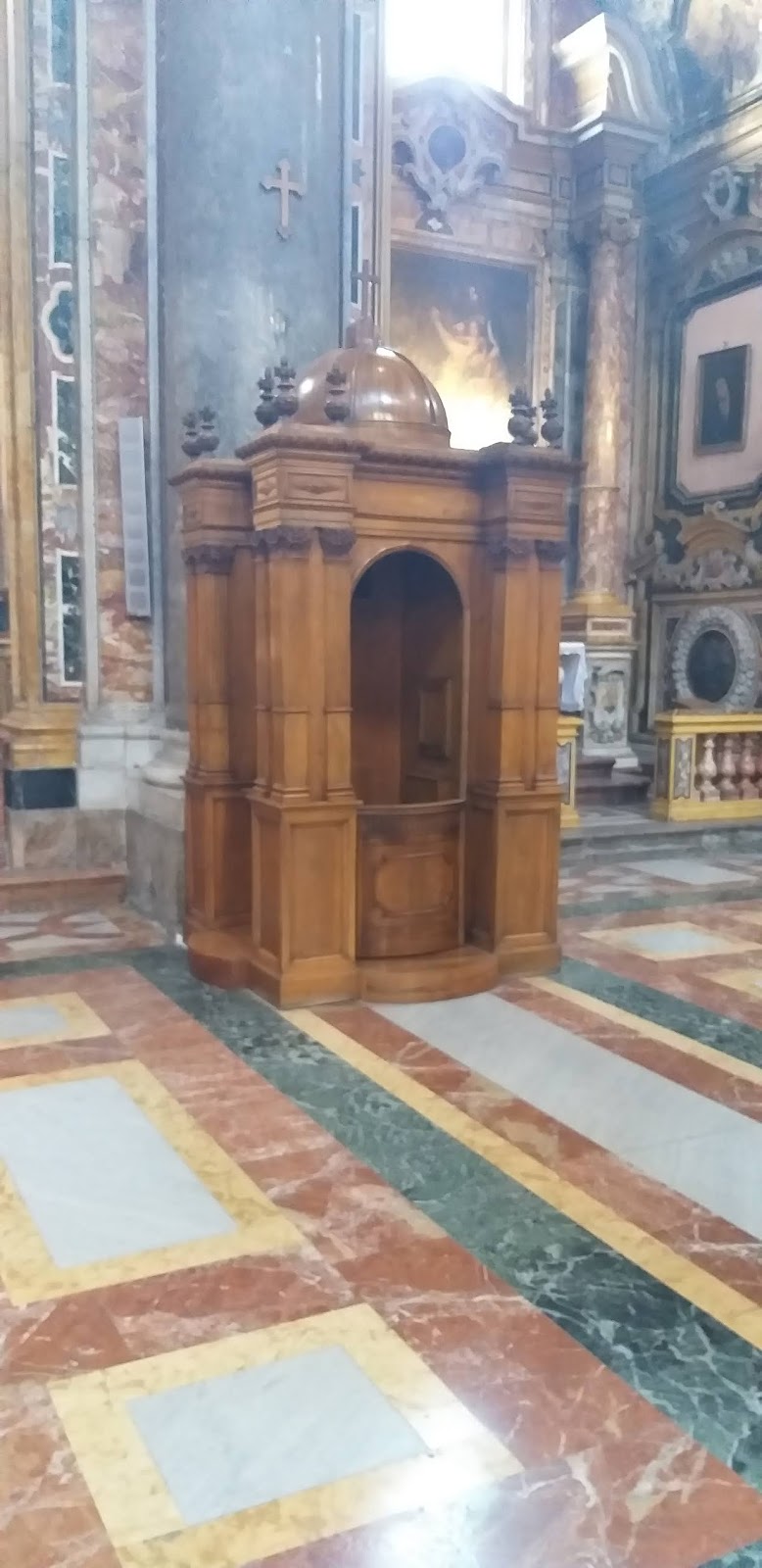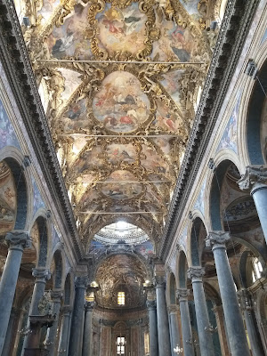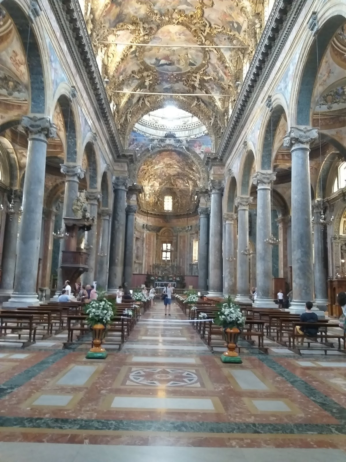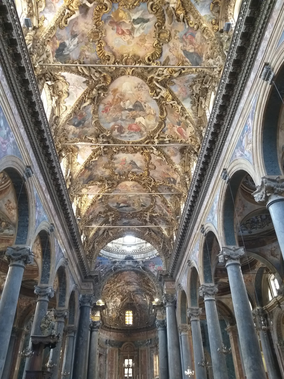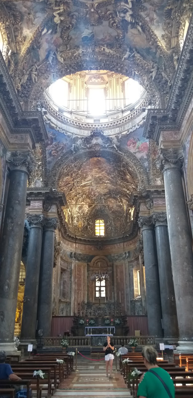 Po kilku minutach spędzonych na Piazza Pretoria, w pełnym słońcu, schroniłam się w położonym po drugiej stronie Via Maqueda kościele S. Giuseppe dei Teatini, o którym mój przewodnik nie wspomina ani słowa. Wielka szkoda, bo naprawdę warto tutaj zajrzeć, nie tylko uciekając przed upałem. Takiego bogactwa zdobień nie widziałam dawno, w żadnym kościele. I choć nie jestem miłośniczką zbyt bogatych wnętrz, tutaj siedziałam i przyglądałam się jak urzeczona. Wszystko było fascynujące – malowidła na sklepieniach, konfesjonały, małe kopuły w bocznych nawach. Prawdziwy mix stylów i natłok wszystkiego – zupełnie jak w całym Palermo 😊. Kościół został zbudowany w stylu baroku sycylijskiego (a jakże) i jest jedną z czterech budowli tworzących Quattro Canti.