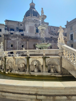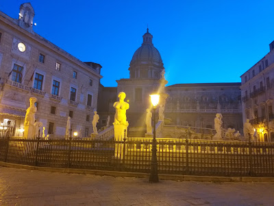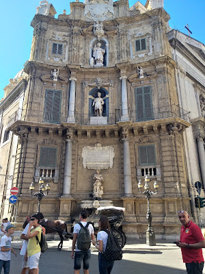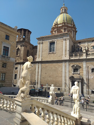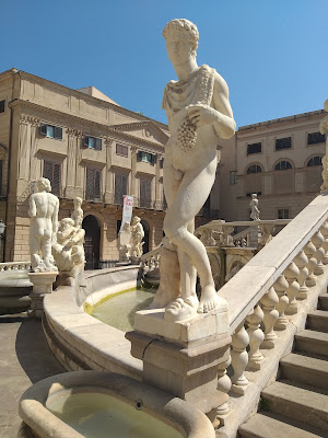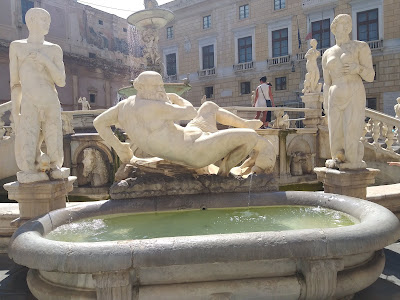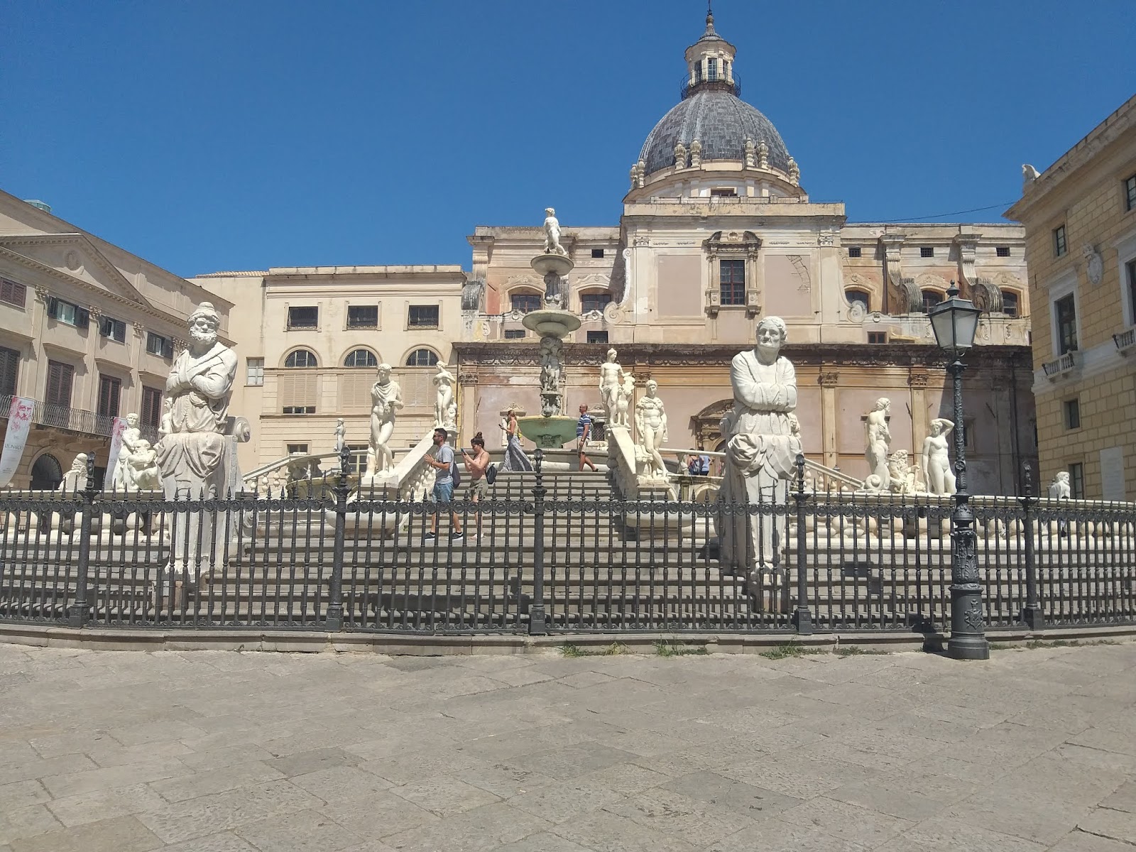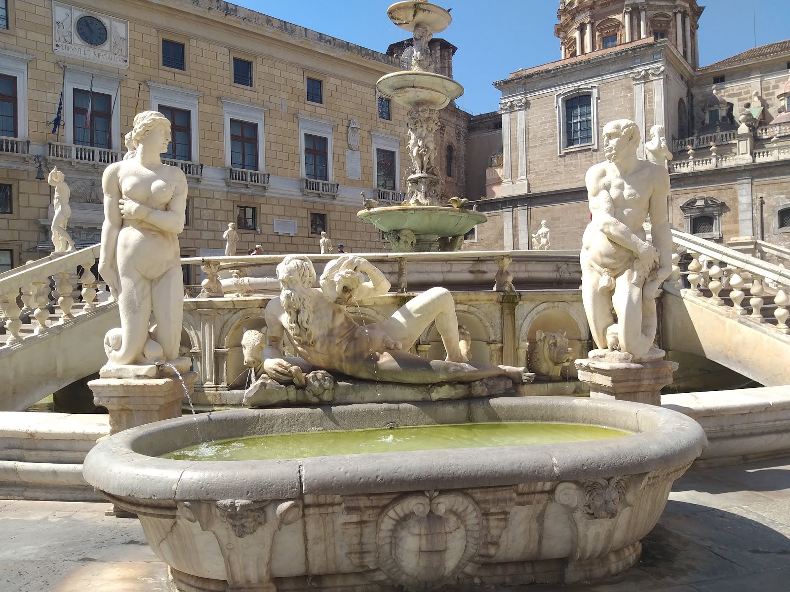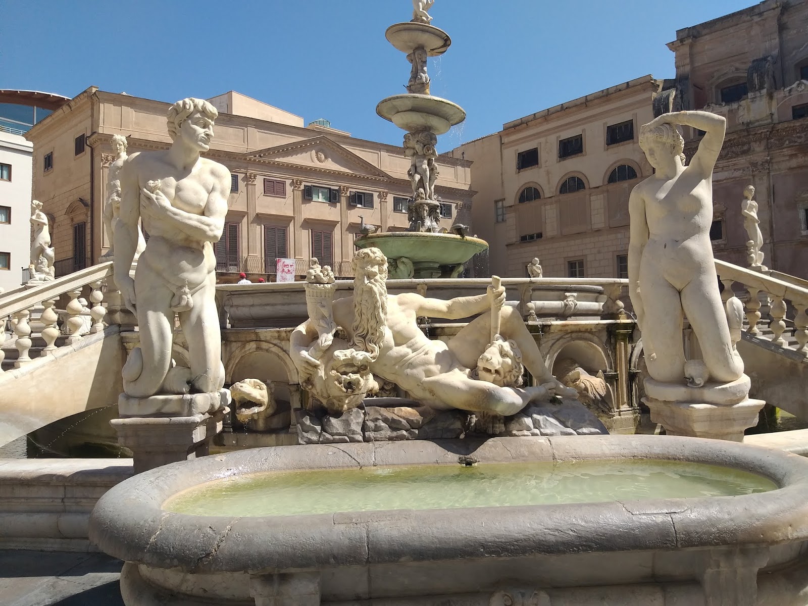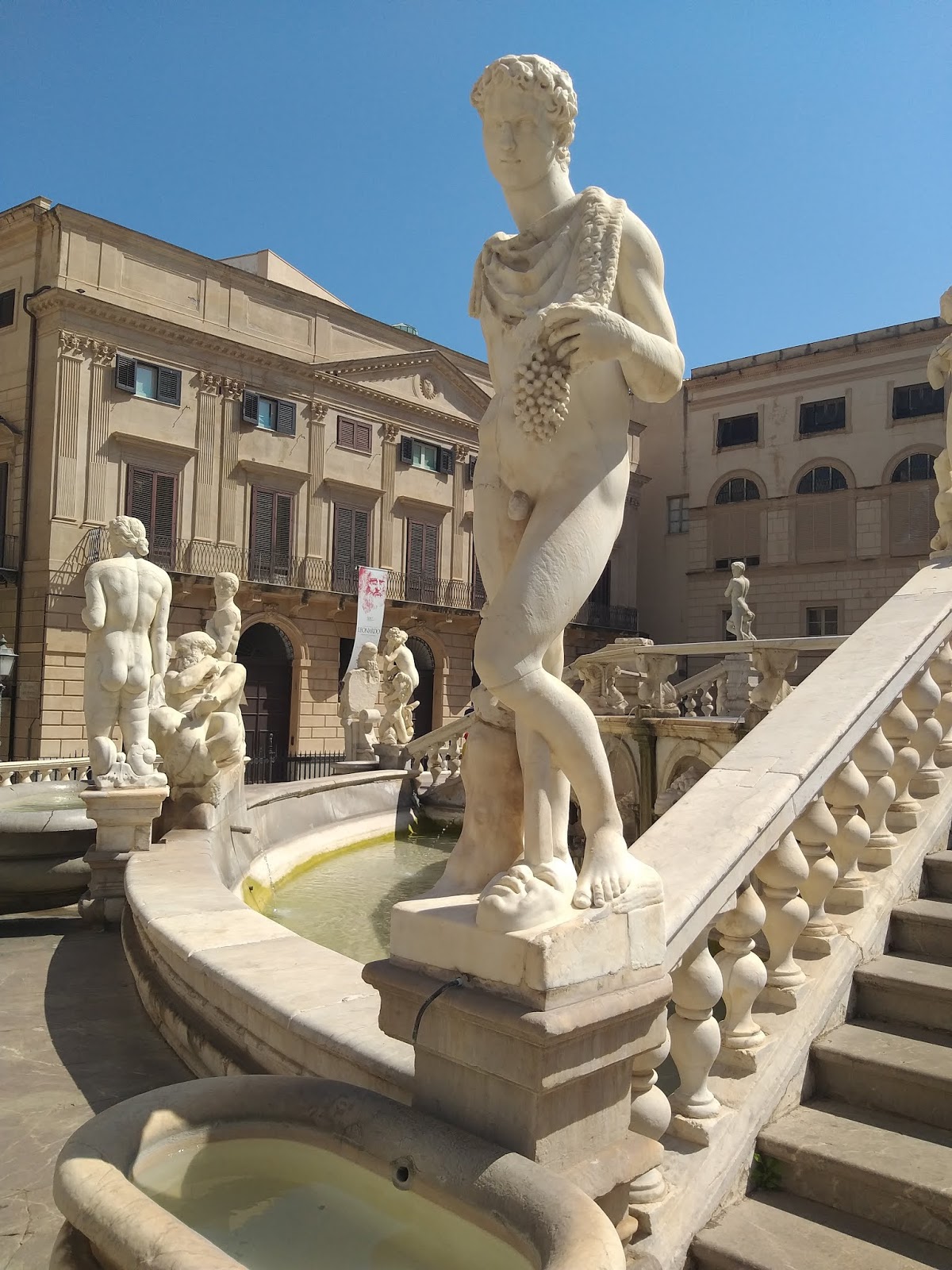 Pierwsza przyciągnęła mój wzrok i wzbudziła we mnie ogromną ciekawość Fontanna Pretoria, nazywana też Fontanną wstydu. Nie wiadomo czy nazwa ta odnosi się do zgorszenia postawą polityków (początkowo fontanna miała stać we Florencji, ale za sprawą skorumpowanych urzędników, znalazła się właśnie w Palermo), czy do nagości wyrzeźbionych na niej postaci. Legenda głosi, że zakonnice z pobliskiego klasztoru nie mogły znieść widoku nagości rzeźb umieszczonych na fontannie i gdy tylko ta stanęła na placu, niektóre z sióstr zakradły się nocą i za pomocą młotków usunęły gorszące części ciała 😉. Na fontannie przedstawione są postaci mitologiczne i można przyjrzeć się każdej z nich z bliska, ponieważ w odróżnieniu od większości tego typu atrakcji Fontanna Pretoria jest otwarta i można wejść na każdy jej poziom i podziwiać detale.
