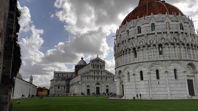 Bardzo lubiłam wracać na Piazza dei Miracoli, bo prezentuje się on pięknie o każdej porze dnia, nocy też. Czasem przysiadywałam na trawie, żeby podziwiać ten niezwykły widok, ale nie wytrzymałam długo, przez silny, przeszywający wiatr. W zależności od tego, z której strony wchodziłam na plac, witał mnie inny widok, a ja zawsze stałam dłuższą chwilę jak urzeczona. Wchodząc pierwszy raz, pierwszą rzeczą, jaką ujrzałam była właśnie Krzywa Wieża, dopiero idąc dalej, odkrywałam pozostałe skarby dumnie stojące na placu. Z kolei wchodząc przez Porta Santa Maria, pierwszym co widzimy, jest Baptysterium św. Jana Chrzciciela. Dzwonnica zdaje się wtedy „wyglądać” zza katedry, jakby chciała zobaczyć, co to za nowi goście wchodzą podziwiać te wszystkie cuda. I właśnie każdej z tych perełek chciałabym poświęcić kilka słów.