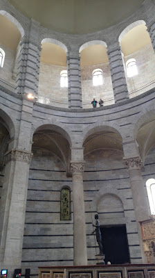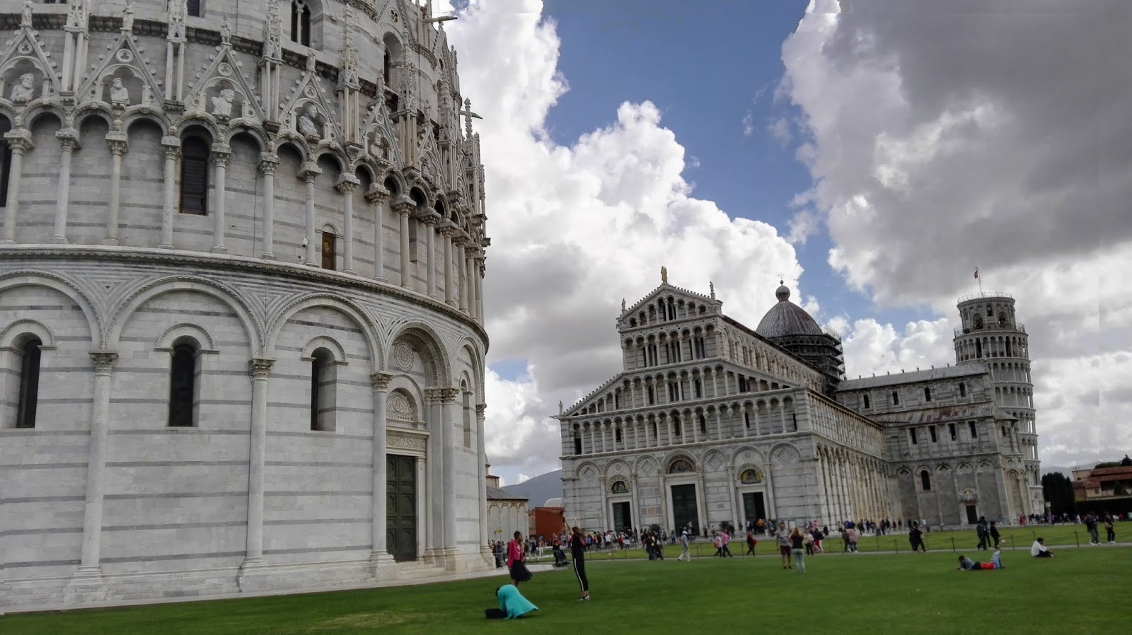 Bardzo lubiłam wracać na Piazza dei Miracoli, bo prezentuje się on pięknie o każdej porze dnia, nocy też. Czasem przysiadywałam na trawie, żeby podziwiać ten niezwykły widok, ale nie wytrzymałam długo, przez silny, przeszywający wiatr. W zależności od tego, z której strony wchodziłam na plac, witał mnie inny widok, a ja zawsze stałam dłuższą chwilę jak urzeczona. Wchodząc pierwszy raz, pierwszą rzeczą, jaką ujrzałam była właśnie Krzywa Wieża, dopiero idąc dalej, odkrywałam pozostałe skarby dumnie stojące na placu. Z kolei wchodząc przez Porta Santa Maria, pierwszym co widzimy, jest Baptysterium św. Jana Chrzciciela. Dzwonnica zdaje się wtedy „wyglądać” zza katedry, jakby chciała zobaczyć, co to za nowi goście wchodzą podziwiać te wszystkie cuda. I właśnie każdej z tych perełek chciałabym poświęcić kilka słów.