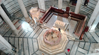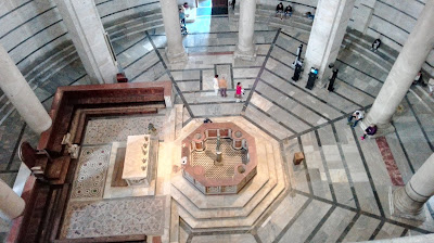 Baptysterium św. Jana Chrzciciela stojące dokładnie naprzeciwko wejścia do katedry jest największym baptysterium we Włoszech. Rzeczywiście jego rozmiary są imponujące. Uwagę zwraca też charakterystyczna kopuła – ma kształt ostrosłupa o ośmiu ścianach. Wnętrze baptysterium kryje wiele ciekawych skarbów. Co ciekawe można je podziwiać także z góry, po wspięciu się krętymi schodami.