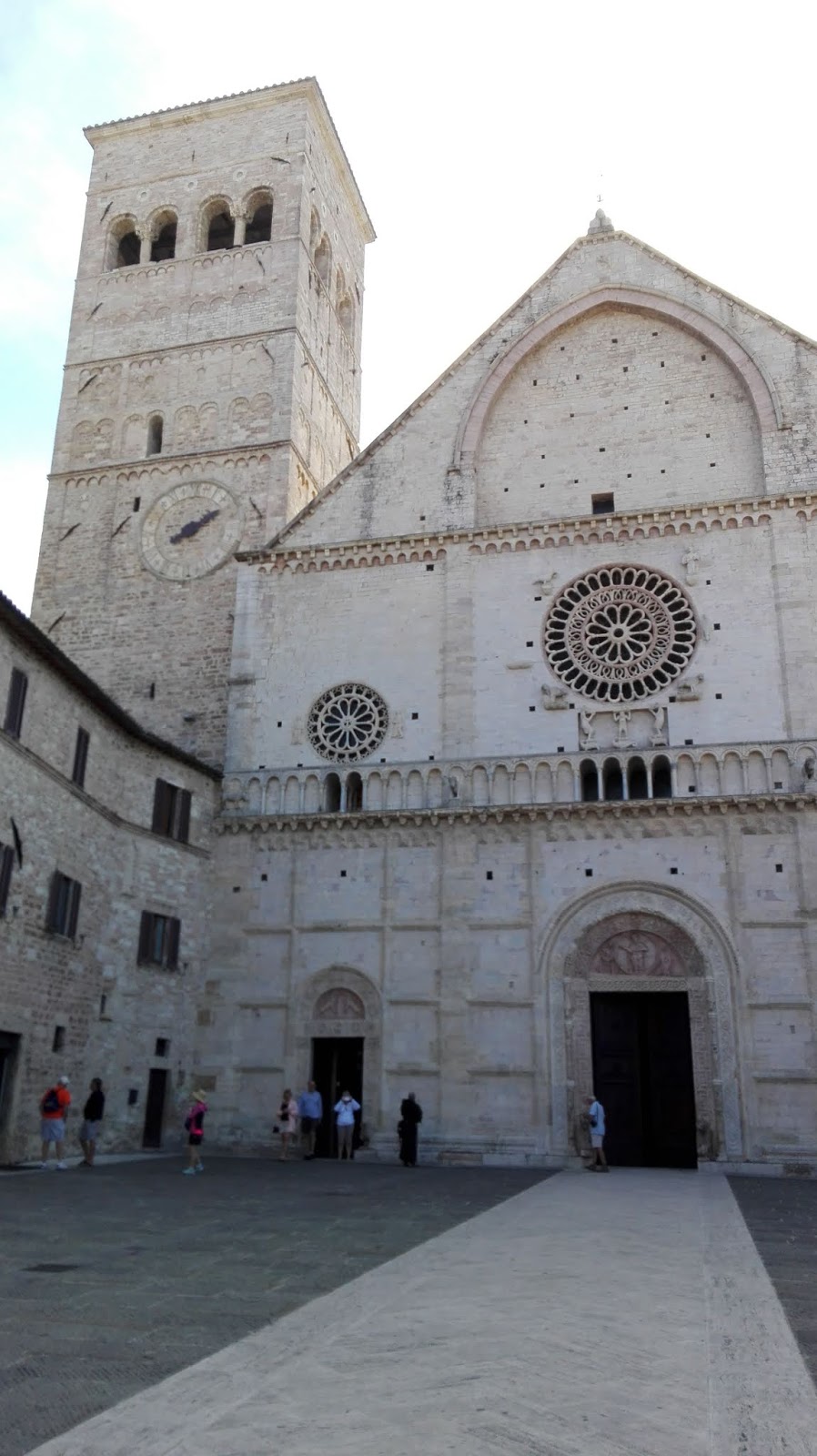 I tak właśnie zaczęłam spacer po Asyżu, spokojnie, bez przepychania się – większość turystów była w bazylikach. Mogłam dosłownie rozkoszować się ciszą, co jakiś czas mijając mieszkańców miasta i odpowiadając na ich sympatyczne powitania 😊. I tym sposobem, bardzo szybko znalazłam się przed Katedrą św. Rufina. Nie byłabym sobą, gdybym oglądała go tylko z zewnątrz, musiałam choćby na moment, zajrzeć do środka. Przy wejściu powitały mnie kamienne postaci Świętego Franciszka i Świętej Klary, ale najciekawsza rzecz ukryta była za drzwiami w bocznej nawie – tam znalazłam mini wystawę obrazów, nie pamiętam czyjego autorstwa, przedstawiających Papieża Jana Pawła II, w różnych momentach jego życia, znane mi już wcześniej z fotografii. Czasem warto zboczyć z utartego szlaku i zobaczyć coś więcej niż tylko kolejne punkty „must see”. Następnym punktem na mojej liście była Bazylika Świętej Klary, aby tam dojść, musiałam pospacerować trochę po wąskimi ulicami, co było mi na rękę, bo musiałam też poszukać czegoś do jedzenia (niezbyt rozsądnie wyruszyłam w drogę bez śniadania). We wnętrzu Bazyliki spędziłam sporo czasu – zdjęcia nie mam, nie miałam stuprocentowej pewności czy można fotografować bazylikę, a jak wspomniałam wcześniej, poważnie traktuję wszelkie zakazy. Pamiętam, że zrobiło na mnie wrażenie, ale wszystko jest kwestią gustu i najlepiej zobaczyć to na własne oczy i sprawdzić, czy nam się spodoba, czy nie. Chciałam nawet podejść do grobu Świętej Klary, ale zniechęciła mnie długa kolejka oczekujących pielgrzymów. Na placu przed kościołem było dość spokojnie, nieliczne grupy turystów odpoczywały przed dalszym zwiedzaniem, gołębie pluskały się w fontannie, a na wprost dumnie prezentowała się górująca nad miastem Rocca Maggiore. Powoli zaczęłam kierować się pod górkę, żeby w końcu zobaczyć to, od czego teoretycznie powinnam zacząć – Bazylikę Świętego Franciszka. Idąc niespiesznie ulicami Asyżu, zastanawiałam się, jak to możliwe, że prawie nie widać tu turystów. Dotychczas Rzym przyzwyczaił mnie do tego, że w pobliżu głównych atrakcji się nie idzie, ale przesuwa w żółwim tempie. Tutaj było inaczej, pomimo popularności miasteczka, głównie wśród pielgrzymów, miałam wrażenie, że nawet na głównym placu jest dość pusto i spokojnie. Dzięki temu można w swoim tempie poruszać się wąskimi uliczkami i podziwiać ukryte zakątki lub widoki na dolinę. Na świętego Franciszka można się tu natknąć dosłownie na każdym kroku -spogląda z niewielkich „kafelków, przedstawiających sceny z jego życia, umieszczonych na ścianach mijanych budynków.