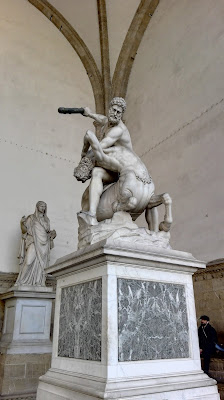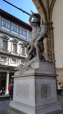 na wypadek, gdybym chciała zorganizować sobie krótki wypad za miasto. Od razu po załatwieniu niezbędnych formalności, zostawiłam bagaż w pokoju i wyruszyłam zrobić małe rozeznanie. W końcu miałam spędzić tu cały tydzień i wypadałoby poznać okolicę. Bez pośpiechu ruszyłam wzdłuż Via Faenza, obok kaplicy i kościoła San Lorenzo. Dosłownie po kilku minutach byłam już na Piazza del Duomo. Przez moment kusiło mnie, żeby wejść do Katedry i obejrzeć ją w środku, ale zniechęciła mnie kolejka. Jeszcze zdążę – w końcu będę tu przez kilka najbliższych dni. Obeszłam Duomo dookoła, wszędzie kolejki – długie ogonki ludzi czekających na wejście na kopułę i na dzwonnicę. Poszłam dalej jedną z uliczek, nie patrząc zbyt często na mapę, bo i po co? Najlepiej poznaje się miasto, po prostu się w nim gubiąc. Ale nie udała mi się ta sztuka. Po chwili stałam już na Piazza della Signoria – głównym placu w mieście. To tutaj znajduje się Pallazzo Vecchio – siedziba lokalnych władz (przy wejściu stoi kopia Dawida dłuta Michała Anioła), konny pomnik Kosmy I Medyceusza i fontanna z olbrzymią figurą Neptuna (akurat wtedy była w trakcie renowacji). Moim zdaniem najpiękniejszą atrakcją na tym ogromnym placu w kształcie litery „L” jest Loggia della Signoria. Dawniej służyła ona, podczas oficjalnych imprez, jako trybuna dla przedstawicieli władz miasta, dziś to wspaniałe muzeum rzeźb na świeżym powietrzu. Od razu weszłam do środka, żeby przyjrzeć się z