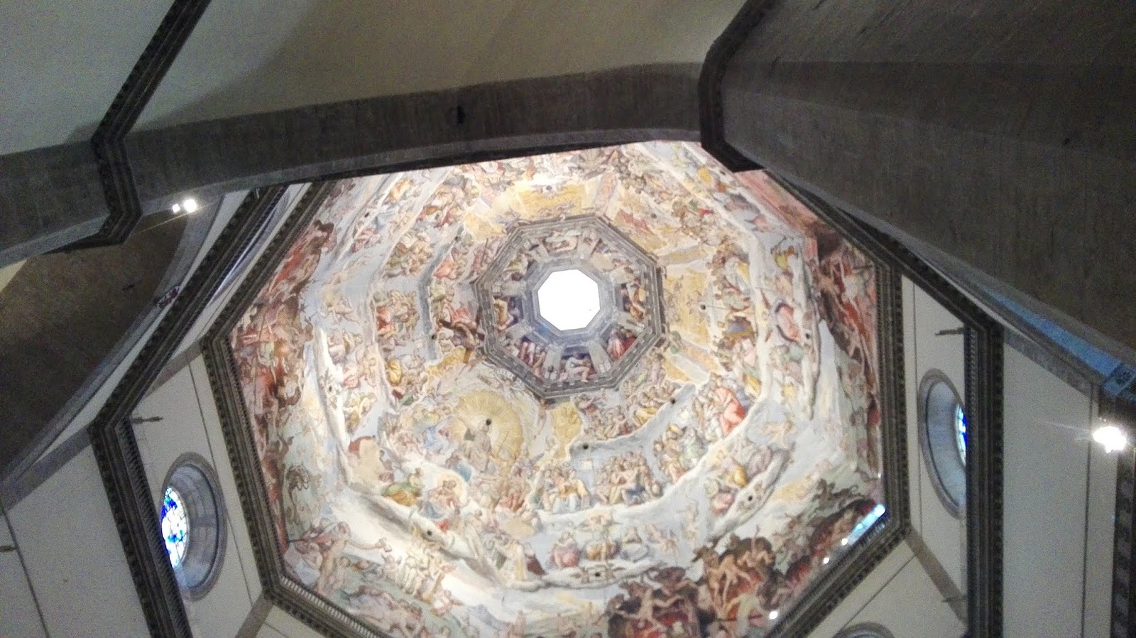 Z samego rana wyruszyłam z postanowieniem, że zaraz po zjedzeniu śniadania ustawię się w kolejce do wejścia do Katedry Santa Maria del Fiore. Było jeszcze dość wcześnie, a na placu już stali pierwsi chętni na zwiedzanie. Muszę jednak przyznać, że wszystko poszło bardzo sprawnie i nie minął nawet kwadrans, a ja byłam już w środku. Muszę Was ostrzec, że jeśli będziecie chcieli wejść do katedry, trzeba być stosownie ubranym (na moich oczach nie wpuszczono pani, która miała krótkie spodenki i bluzkę ze sporym dekoltem, odsłaniającą ramiona) Fasada katedry znana jest chyba wszystkim italofilom, a nawet nie tylko im – wykonana z marmuru w trzech kolorach: białym, zielonym i bladoróżowym, zdobiona posągami i ornamentami. W środku świątynia nie wygląda już tak bogato. Spotkałam się nawet z opiniami, że nie warto wchodzić do środka, bo z zewnątrz kościół jest piękny, ale w środku to jakoś tak biednie. Ja nie podzielam tej opinii, bo jak już niejednokrotnie podkreślałam, mniej znaczy więcej, a skromnie nie znaczy biednie, czy tym bardziej brzydko. Najlepiej sami przekonajcie się czy w Wasz gust trafia kolorowa posadzka, freski zdobiące kopułę czy dzieła uświetniające ściany katedry.
