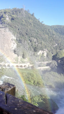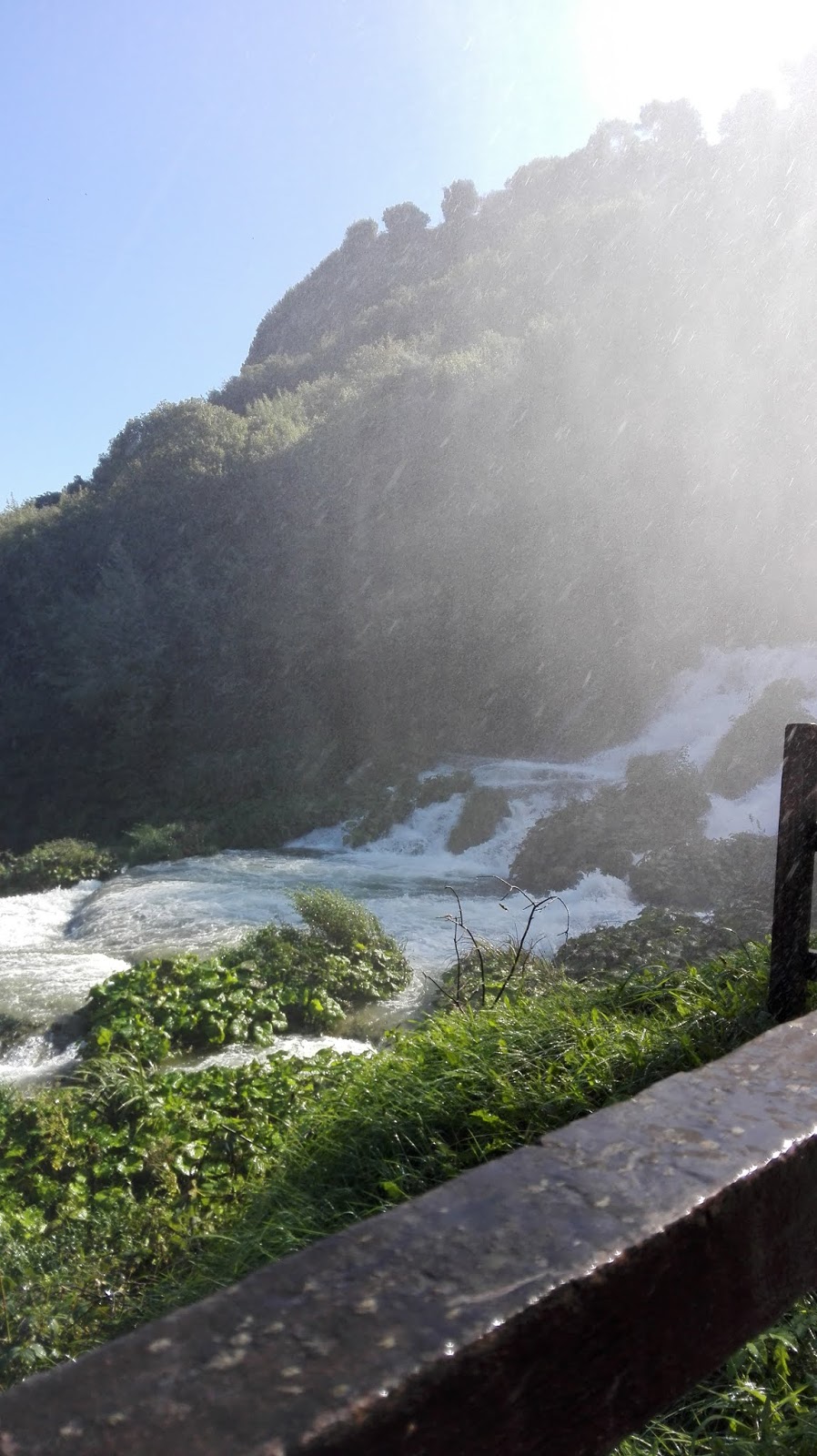 „Uruchamianiu” wodospadu towarzyszy głośny alarm zwiastujący otwarcie tamy i po chwili można zobaczyć wodę spadającą z całą swoją mocą. Pamiętam, że dźwięk syreny zaskoczył mnie, kiedy dopijałam poranne cappuccino, w kawiarni położonej u stóp wzgórza, obok kasy biletowej. Szybko dokończyłam kawę i powoli zaczęliśmy wchodzić pod górę, żeby stamtąd oglądać zieloną dolinę. Wspinaczce towarzyszy huk spływającej z ogromną siłą wody, ale  wodę nie tylko tam słychać. Drobne krople odbijają się od powierzchni i unoszą się dosłownie wszędzie, osiadają na włosach, twarzy i ubraniach. Przed wyprawą do Cascata delle Marmore dobrze więc zaopatrzyć się w ochronną pelerynę przeciwdeszczową. Droga pod górę nie jest trudna do pokonania i nie zajmuje dużo czasu, a widok rozpościerający się dookoła, wynagradza trud podejścia. Jeśli ktoś z Was z różnych względów nie byłby w stanie pokonać całej trasy na raz, nie ma problemu, żeby przystanąć w jakimś zacisznym miejscu i chwilę odpocząć. Można też przejść niezbyt długim, pełnym wilgoci tunelem wprost pod jeden ze spadających wodospadów. Wtedy, gwarantuję Wam, wyjdziecie stamtąd mokrzy od stóp do głów 😉. Na pokonanie całej trasy i cieszenie się pięknymi widokami na okolicę, należy poświęcić około dwóch godzin (minimum).