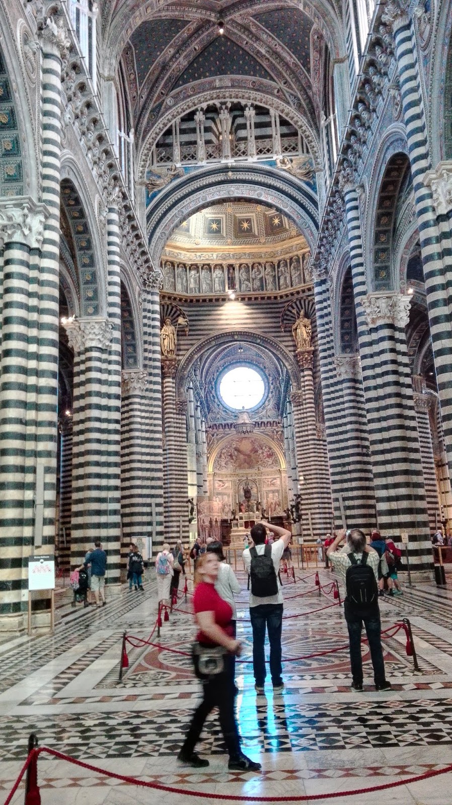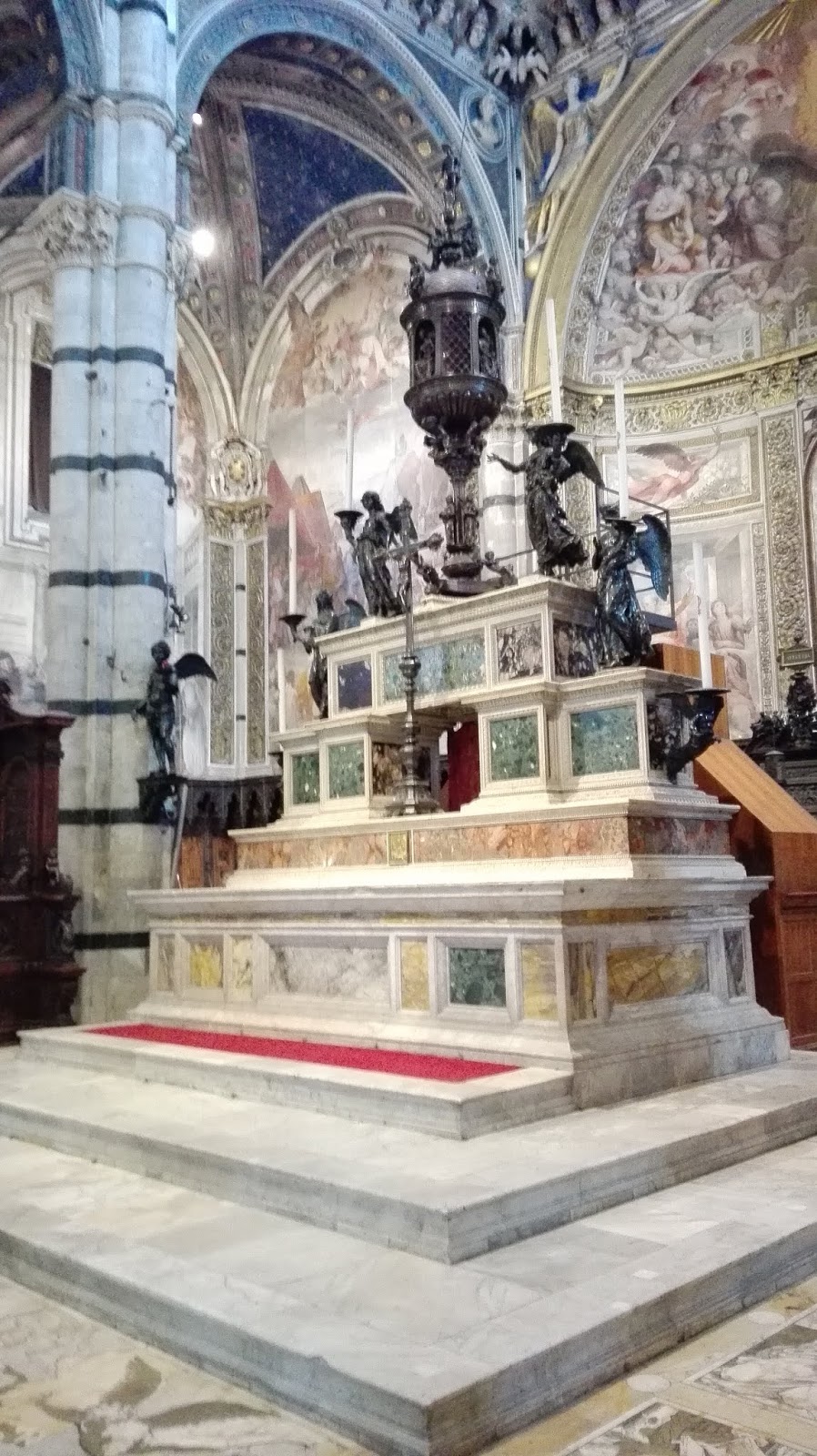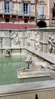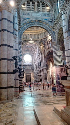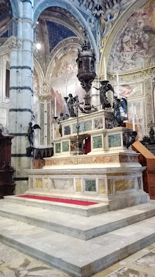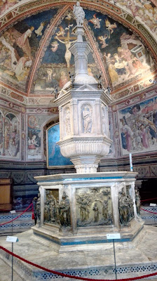 Fasadę katedry zaprojektował Giovanni Pisano. Mieni się ona złotymi zdobieniami i przypomina tę w Orvieto, choć niewątpliwie  jest bardziej okazała. Wnętrze także jest bardzo bogate, marmurowe posadzki, nad którymi pracowało blisko 40 artystów, rzeźby autorstwa m.in. Michała Anioła i Donatella, bogato zdobiona ambona, czy wreszcie Capella Piccolomini. Nie mogę odmówić piękna sieneńskiej katedrze, ani kunsztu wykonania najdrobniejszych nawet elementów, ale taka ilość dzieł, na tak niewielkiej powierzchni mnie przytłacza, zbyt wiele rzeczy dosłownie „krzyczy” o  moją uwagę. Zdecydowanie wolę wnętrza bardziej skromne. Nie miałam w planach zwiedzania Muzeum Katedralnego ani tarasu widokowego (nie wiem, czy był w tym dniu czynny, bo nie widziałam na nim ludzi), a  jedynie  Baptysterium. Co ciekawe, w Sienie nie stoi ono na jednym placu z katedrą i dzwonnicą, jak w Pizie czy Florencji, ale wszystkie wydają się „wciśnięte” pomiędzy inne, gęsto stojące dookoła budynki. Lekko przytłoczona i zmęczona potrzebowałam zastrzyku energii przed dalszym zwiedzaniem. Szybka kawa z toskańskim ciasteczkiem w pobliskiej kawiarni i mogłam ruszać dalej. Skręciłam w jedną z uliczek prowadzących do Baptysterium św. Jana Chrzciciela, które przylega od zewnętrznej strony do tylnej części katedry. W centrum znajduje  się oczywiście chrzcielnica, nad którą pracowali wielcy rzeźbiarze – Donatello i  Jacopo della Quercia, ściany ozdobione są licznymi freskami.