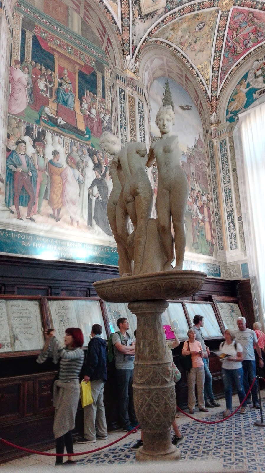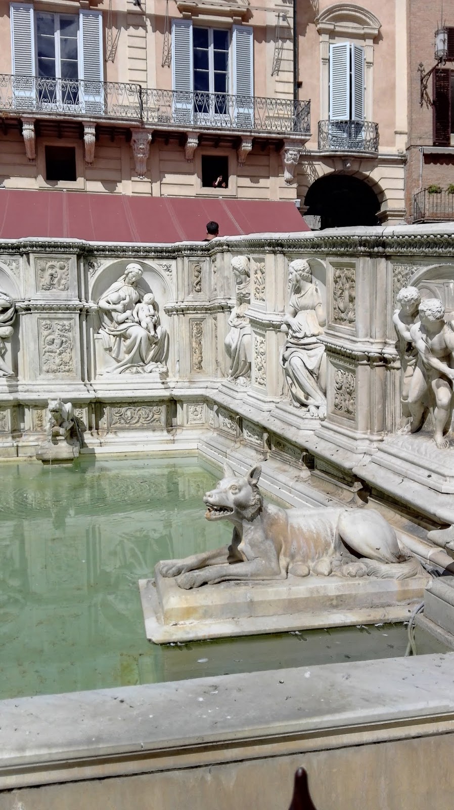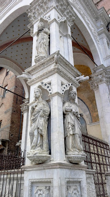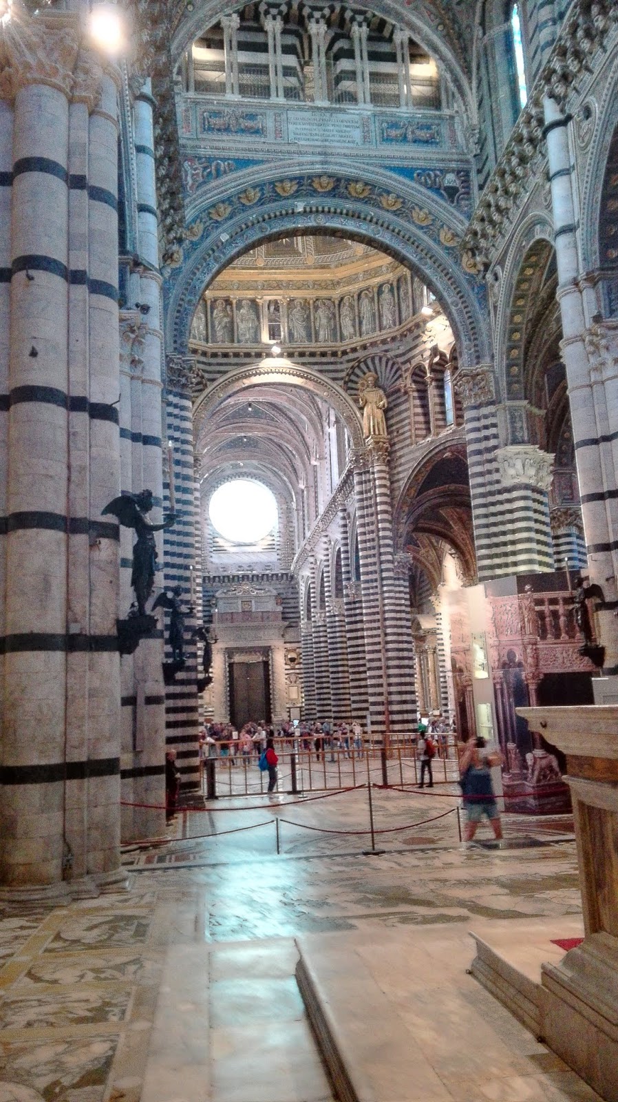 Fasadę katedry zaprojektował Giovanni Pisano. Mieni się ona złotymi zdobieniami i przypomina tę w Orvieto, choć niewątpliwie  jest bardziej okazała. Wnętrze także jest bardzo bogate, marmurowe posadzki, nad którymi pracowało blisko 40 artystów, rzeźby autorstwa m.in. Michała Anioła i Donatella, bogato zdobiona ambona, czy wreszcie Capella Piccolomini. Nie mogę odmówić piękna sieneńskiej katedrze, ani kunsztu wykonania najdrobniejszych nawet elementów, ale taka ilość dzieł, na tak niewielkiej powierzchni mnie przytłacza, zbyt wiele rzeczy dosłownie „krzyczy” o  moją uwagę. Zdecydowanie wolę wnętrza bardziej skromne. Nie miałam w planach zwiedzania Muzeum Katedralnego ani tarasu widokowego (nie wiem, czy był w tym dniu czynny, bo nie widziałam na nim ludzi), a  jedynie  Baptysterium. Co ciekawe, w Sienie nie stoi ono na jednym placu z katedrą i dzwonnicą, jak w Pizie czy Florencji, ale wszystkie wydają się „wciśnięte” pomiędzy inne, gęsto stojące dookoła budynki. Lekko przytłoczona i zmęczona potrzebowałam zastrzyku energii przed dalszym zwiedzaniem. Szybka kawa z toskańskim ciasteczkiem w pobliskiej kawiarni i mogłam ruszać dalej. Skręciłam w jedną z uliczek prowadzących do Baptysterium św. Jana Chrzciciela, które przylega od zewnętrznej strony do tylnej części katedry. W centrum znajduje  się oczywiście chrzcielnica, nad którą pracowali wielcy rzeźbiarze – Donatello i  Jacopo della Quercia, ściany ozdobione są licznymi freskami.