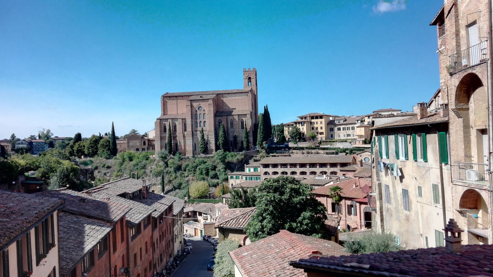 Wreszcie dotarłam do Bazyliki św. Dominika, ale najpierw postanowiłam obejść ją dookoła i obejrzeć okolicę. Kiedy odeszłam kawałek od kościoła, moim oczom ukazała się ta część miasta, z  której właśnie  przyszłam. Wyraźnie widziałam kopułę katedry i strzelistą dzwonnicę, a po lewej stronie, górującą nad Piazza del Campo Torre del Mangia. Jedna z najpiękniejszych włoskim panoram, jakie widziałam. Uroku dodawała jej barwa budynków, oświetlanych przez ostre słońce. Pamiętacie szkolne farby plakatowe, a wśród nich odcień siena palona? Po tym, co zobaczyłam, wiem, że ta nazwa nie wzięła się znikąd 😉. Mogłabym stać tam i patrzeć jak kolor domów zmienia się wraz z przemieszczaniem się słońca na niebie, ale nie po to tam pojechałam. Wreszcie weszłam do kościoła, w którym przechowywane są relikwie św. Katarzyny. Wnętrze ozdobione jest licznymi freskami, na jednym z nich widnieje wizerunek świętej ze Sieny, uznawany za najbardziej wiarygodny.