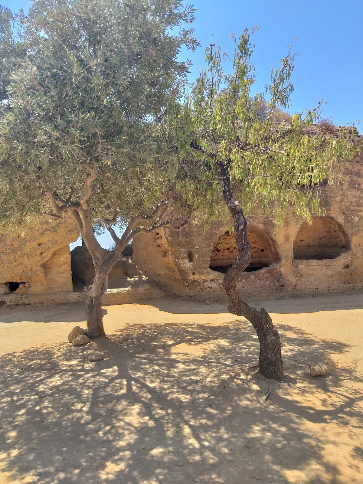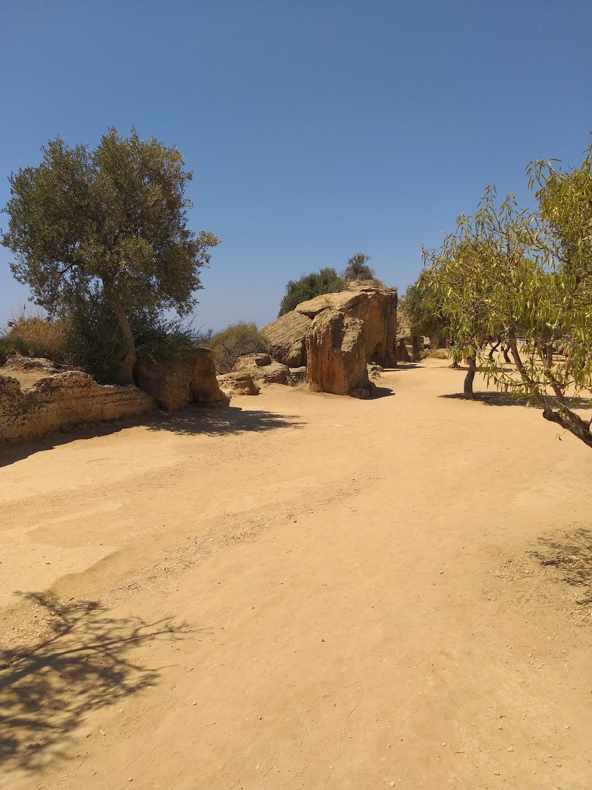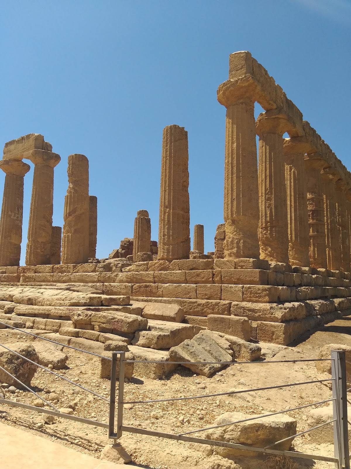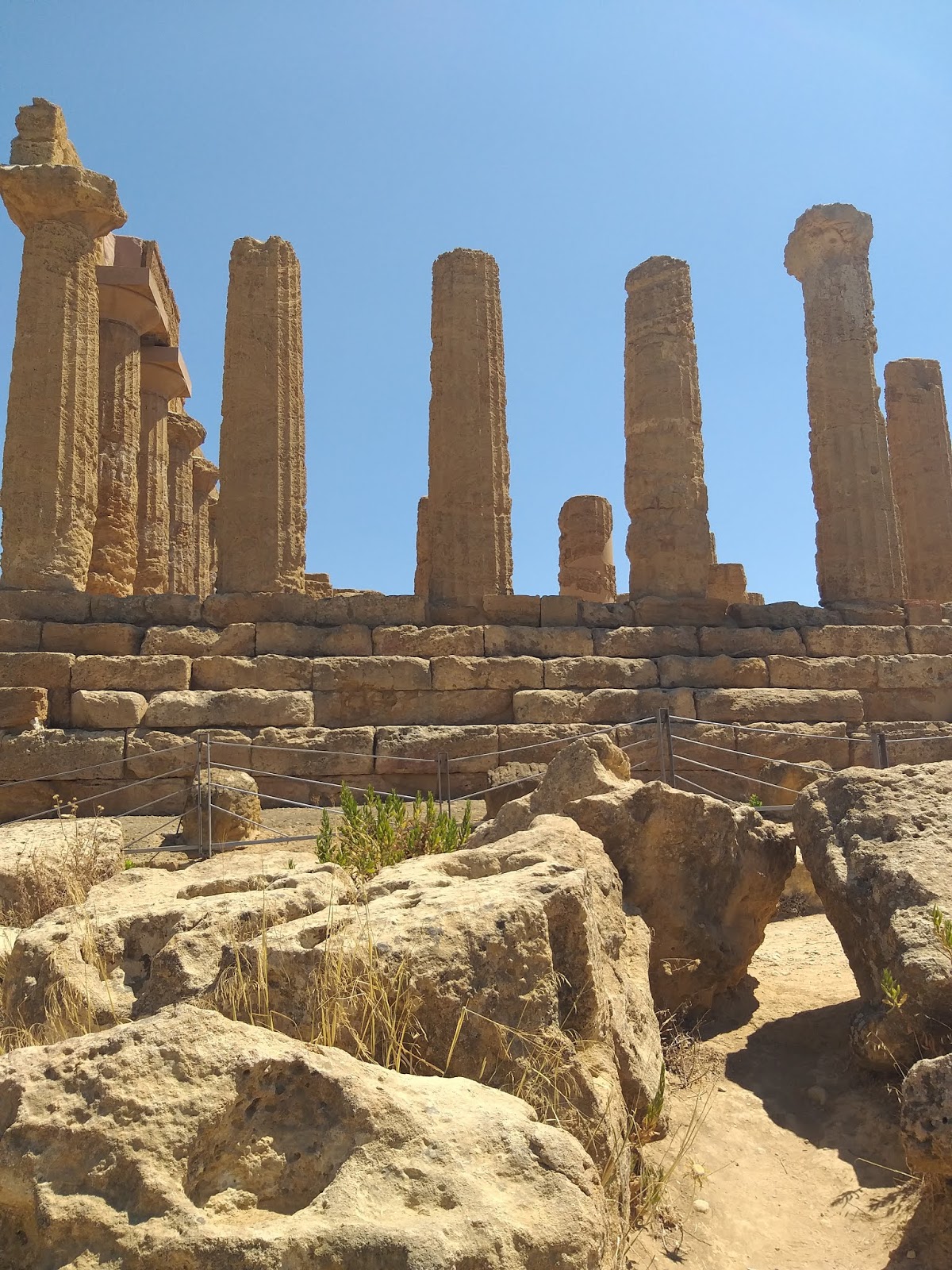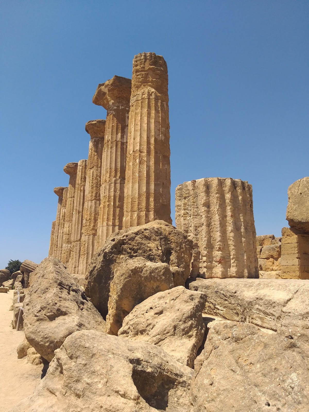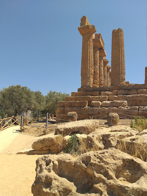 Kiedy już udało mi się wejść na teren parku, pierwsza na mojej drodze stanęła Świątynia Junony (Tempio di Giunone), doskonale widoczna już od wejścia, zbudowana na planie prostokąta, w stylu doryckim. Można znaleźć w niej pozostałości ołtarza, a niektóre bloki noszą ślady po ogniu podłożonym przez Kartagińczyków w 406 r. p.n.e. Idąc dalej w dół, po lewej stronie można podziwiać zachowane fragmenty murów otaczających teren dzisiejszego parku oraz grobowce w kamiennych niszach. Tutaj też rozciąga się Giardino dei Giusti del Mondo, czyli Ogród Sprawiedliwych Wśród Narodów Świata.