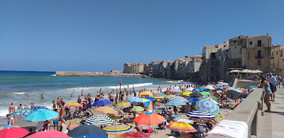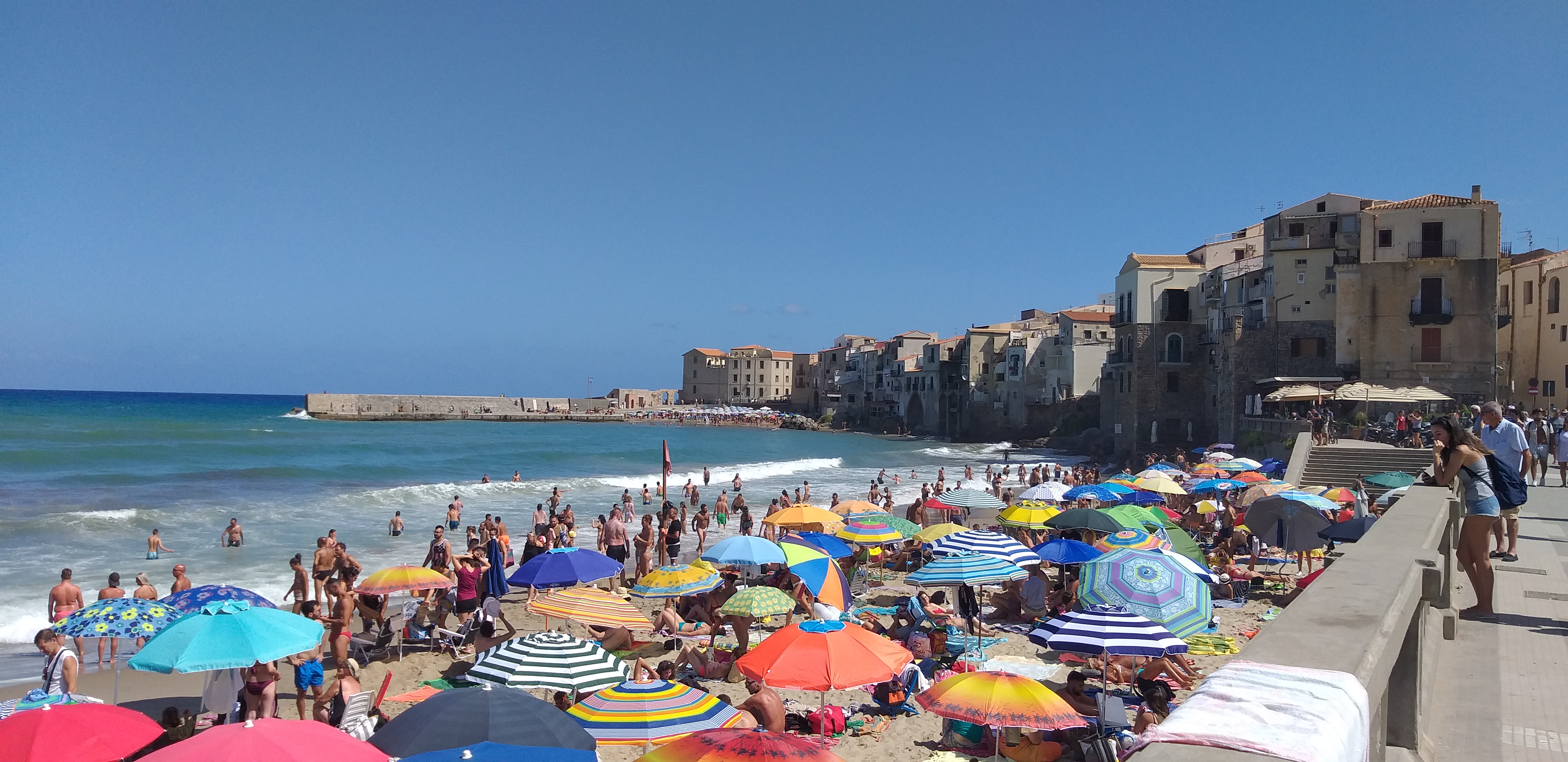 Na wypad do Cefalù wybrałam może kiepski termin – 15 sierpnia to słynne Ferragosto. Początkowo było to pogańskie święto, obchodzone z okazji zakończenia zbiorów, we wrześniu, później przeniesione przez cesarza Augusta na sierpień noszący jego imię (nazwa pochodzi z łacińskiego Feriae Augusti, czyli wakacje Augusta). Dziś zbiega się ono z katolickim świętem Wniebowzięcia Najświętszej Marii Panny. Jest to dzień wolny od pracy i wszyscy wykorzystują ten fakt i wyjeżdżają na krótki odpoczynek poza miasto. Sprawdziłam, że pociągi na trasie Palermo-Cefalù kursowały w tym dniu normalnie, więc plan na dzień świąteczny był gotowy. Już w pociągu przekonałam się, o co chodzi z tym świętowaniem. Już w pociągu było tak gęsto, że ciężko wcisnąć choćby szpilkę. Całe rodziny, grupy młodzieży, a także turyści – pełen pociąg ludzi, parasoli i niezbędnego na plaży ekwipunku. Większość z nich wysiadła ze mną na stacji w Cefalù i cała grupa od razu pomaszerowała w kierunku plaży. Pomyślałam sobie wtedy, że pójdę za nimi, może wtedy łatwiej zorientuję się co dokąd pójść dalej.