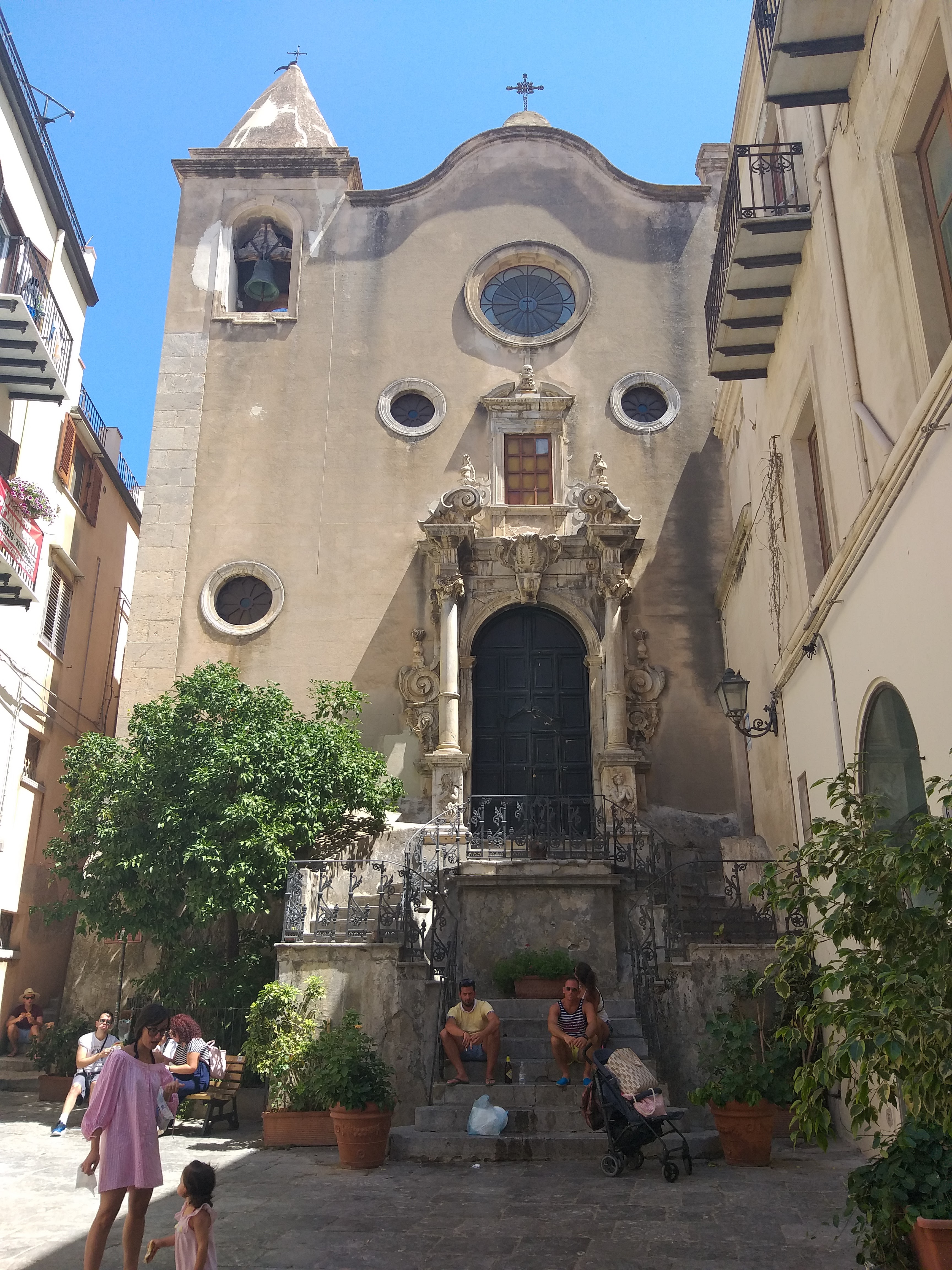 Błądząc dalej wśród uliczek, dopiero po chwili zorientowałam się, że ucichł gwar, który dało się słyszeć w bardziej popularnych punktach miasta. To był dla mnie sygnał, żeby zawrócić, bo na pewno oddaliłam się od jego zabytkowej części. Zawróciłam i dosłownie po chwili byłam już na Piazza del Duomo, pełnego restauracji, barów i kawiarni, te z kolei wypełnione były zmęczonymi zwiedzaniem i głodnymi gośćmi. Przecięłam plac, pełen apetycznych zapachów i skierowałam się do tutejszej katedry. Pokonałam schody przed bramą i pełna ekscytacji weszłam do środka. Niestety piękną mozaikę z Chrystusem Pantokratorem musiałam obejrzeć, stojąc w przedsionku, bo akurat trwała msza. Kto by się tego spodziewał w święto 😉. Duomo di Cefalù została ufundowana przez Normańskiego króla Rogera II, który uratował się od sztormu i bezpiecznie dobił do tutejszego brzegu. W podziękowaniu za ocalenie życia wybudował katedrę. Świątynia jest połączeniem wielu stylów architektonicznych, ale w tamtej chwili nie było mi dane sprawdzić. Postanowiłam szybko wyjść, żeby zbadać inne zakątki miasteczka i do kościoła w drodze powrotnej. Może msza już się skończy i będę mogła obejrzeć tę perełkę dokładniej.