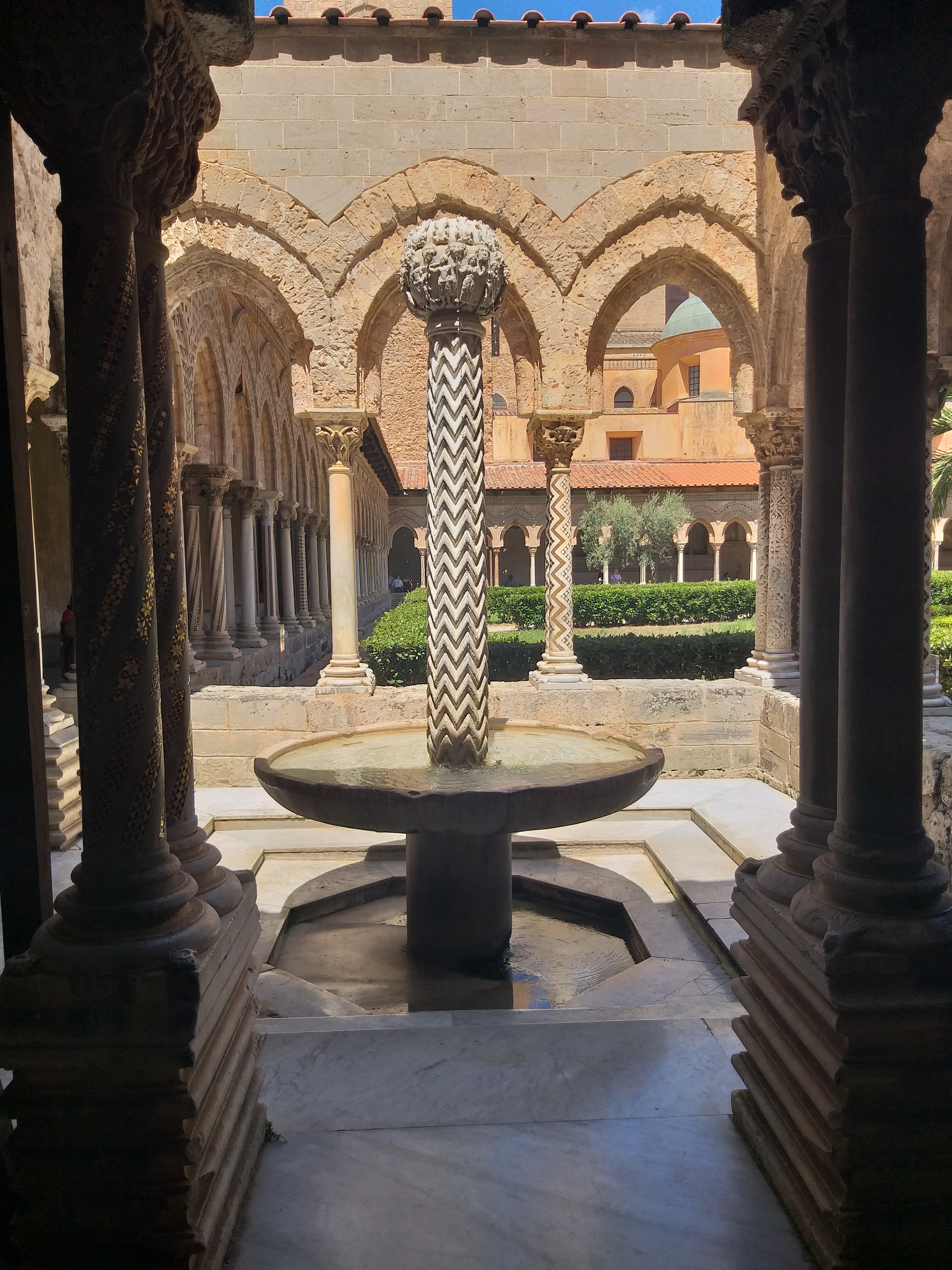 Tuż obok jest kolejne ciekawe miejsce do odwiedzenia. Wejście do niego znajduje się na niewielkim placyku za katedrą. Mowa oczywiście o klasztorze bsenedyktynów i jego słynnych krużgankach. Miejsce idealne do zwiedzania w upalny dzień. To, co tam zobaczyłam, również mnie oczarowało – wszystkie cztery boki krużganków tworzą arkady wzniesione na 228 parach kolumn. Podobno nie ma dwóch identycznych par, czasem różnią się zaledwie detalami. Przyglądałam się im i rzeczywiście nie zauważyłam, żeby któraś się powtórzyła – nawet jeśli zdobił je taki sam ornament, różniły się wieńczącymi je głowicami. Prawdziwa mnogość stylów, znajdziecie tu rzeźbione sceny biblijne, symbole islamskie oraz chrześcijańskie. W jednym z rogów umieszczona jest, także otoczona kolumnami fontanna. Przyjemnie przysiąść na jednej z ław i posłuchać szumu sączącej się wody.