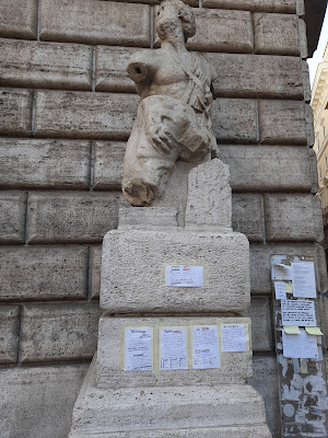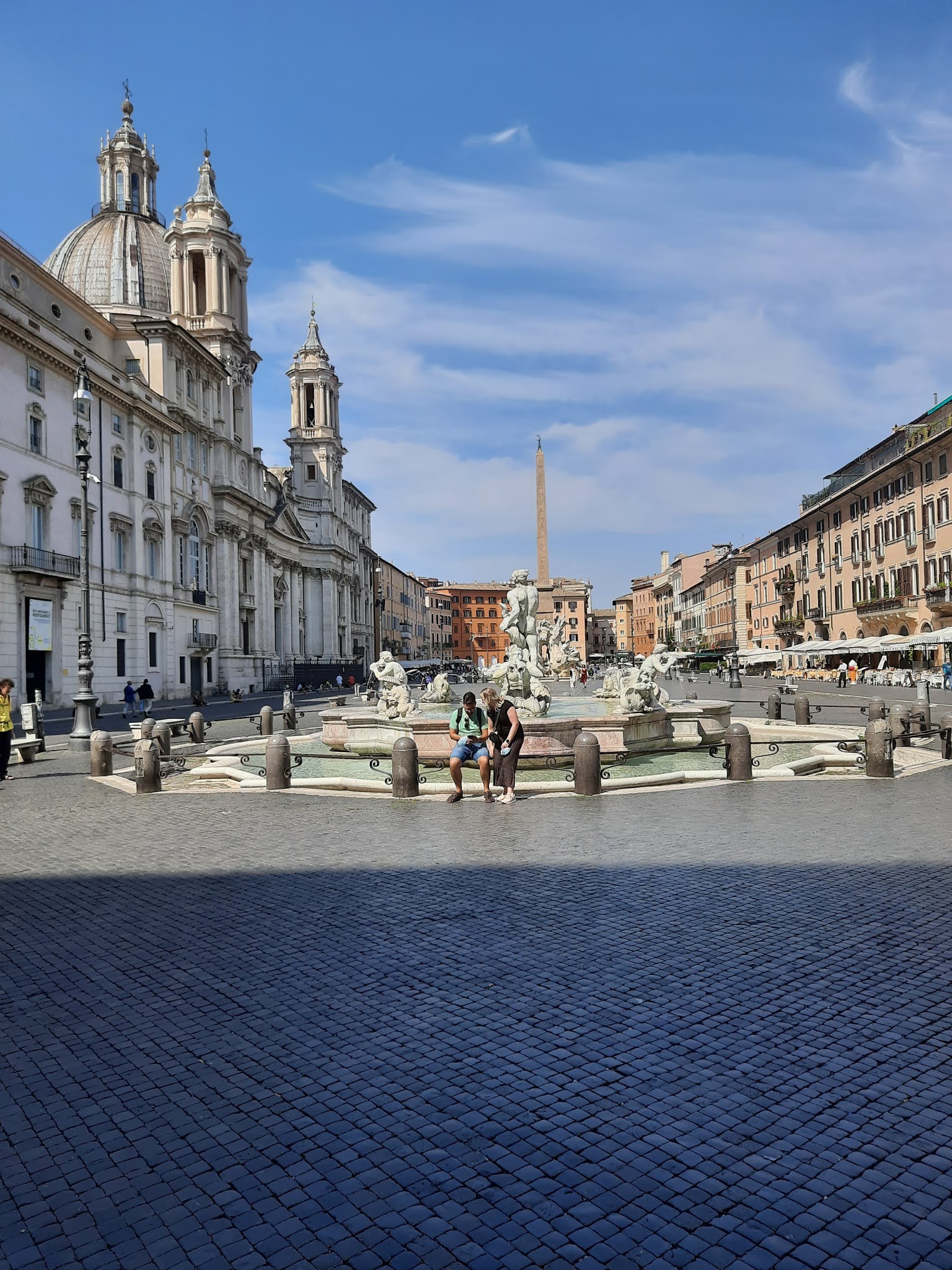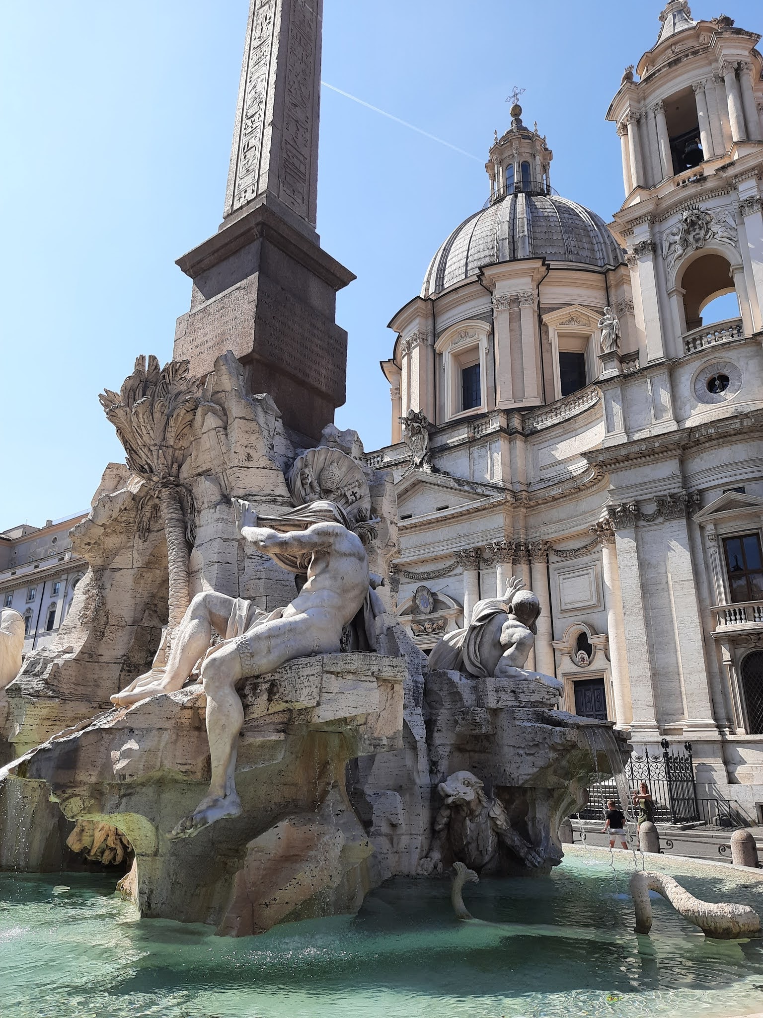 Najlepsze, czyli swoją ulubioną część Wiecznego Miasta zostawiłam sobie na popołudnie. Po krótkim odpoczynku ruszyłam dalej – swoją ulubioną spacerową trasą (pisałam o niej tutaj) Chciałam zobaczyć wszystko, przez co zaglądałam w każdy zakamarek, jakbym zapomniała, że mam na to jeszcze cały tydzień i na pewno zdążę jeszcze zobaczyć dużo nowych miejsc i nacieszyć się tymi, które już znam. Nie mogłam napatrzeć się na bezludny Piazza Navona – tutejsza Fontanna Czterech Rzek zawsze robi na mnie ogromne wrażenie, zadziwiające co ludzkie ręce potrafią wyczarować z zimnego marmuru. Ukochana via del Governo Vecchio nadal tętniła życiem, ale w inny sposób niż zawsze, nawet Pasquino był dość rozmowny i trafnie komentował otaczającą go rzeczywistość. Jak zwykle ścisnęło mi gardło, kiedy zza rogu wyłonił się mój ukochany Zamek Świętego Anioła. Wtedy po raz drugi poczułam, że naprawdę jestem w Rzymie i to wszystko mi się nie śni. Wszystkie Anioły na moście odliczyły się i niewiele zmieniły się od naszego ostatniego spotkania 😉. Z kolei plac Świętego Piotra był bardzo odmieniony – zniknęły z niego krzesła przygotowane na cotygodniowe audiencje i znaczna część drewnianych barierek. Przypomniało mi się jak Luca Spaghetti, w swojej książce wspominał czasy dzieciństwa, kiedy wieczorami grał z przyjaciółmi w piłkę na ogromnym placu przed bazyliką. Dziś znów byłoby to możliwe. Po lewej stronie idąc od via della Conciliazione, tuż obok wozu Poczty Watykańskiej, znajdziecie wymowną rzeźbę „Aniołowie nieświadomi” przedstawiającą uchodźców. Jej autorem jest Kanadyjczyk Timothy Schmalz, a odsłonięta została przy okazji obchodów Światowego Dnia Migranta i Uchodźcy, jesienią zeszłego roku. Ten wyjątkowy pomnik przedstawia 140 osób różnej narodowości, o różnym statusie społecznym, pochodzących z różnych kręgów kulturowych i okresów historycznych, ściśniętych ciasno na niewielkiej barce. Postaci są bardzo wymowne, a i ich liczba nie jest przypadkowa – na placu znajdziemy dokładnie 140 posągów przedstawiających świętych, którzy także wywodzili się z różnych środowisk i żyli w różnych epokach w dziejach ludzkości.